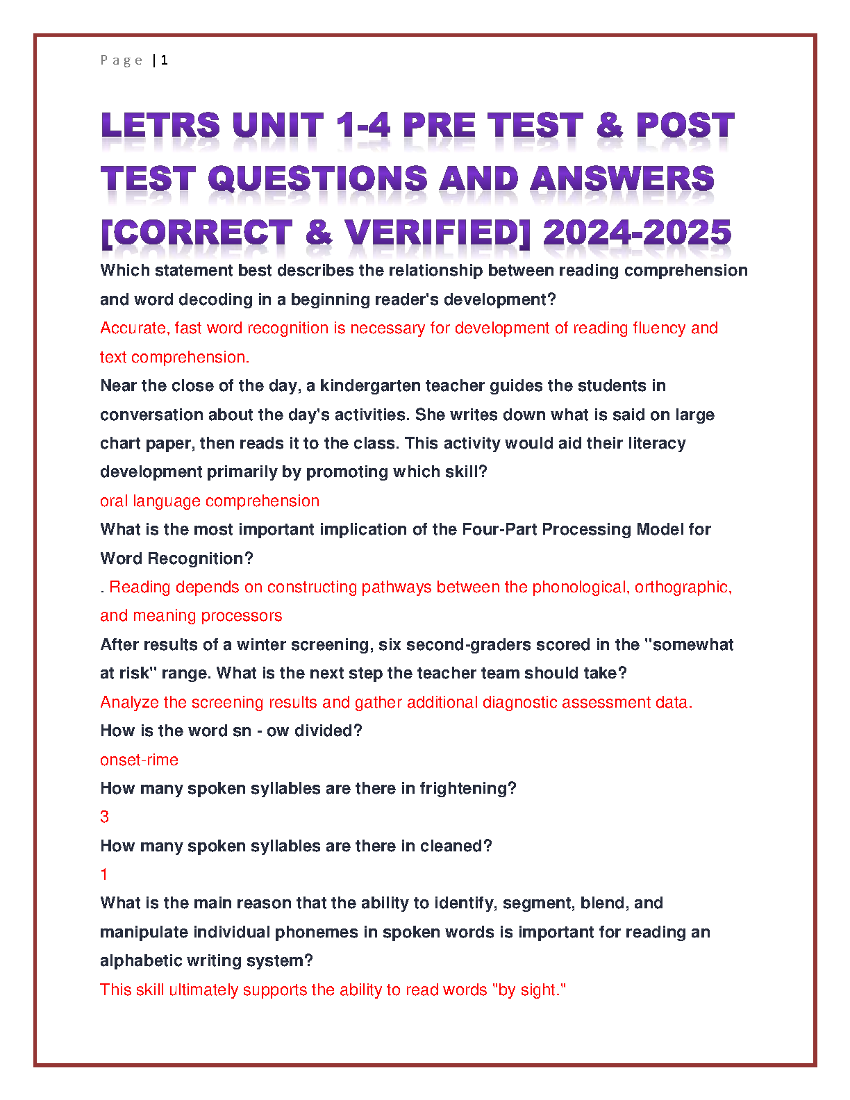 LETRS Unit 1-4 Pre & Post Test Questions and Answers (2024-2025 Edition) by Unknown Author