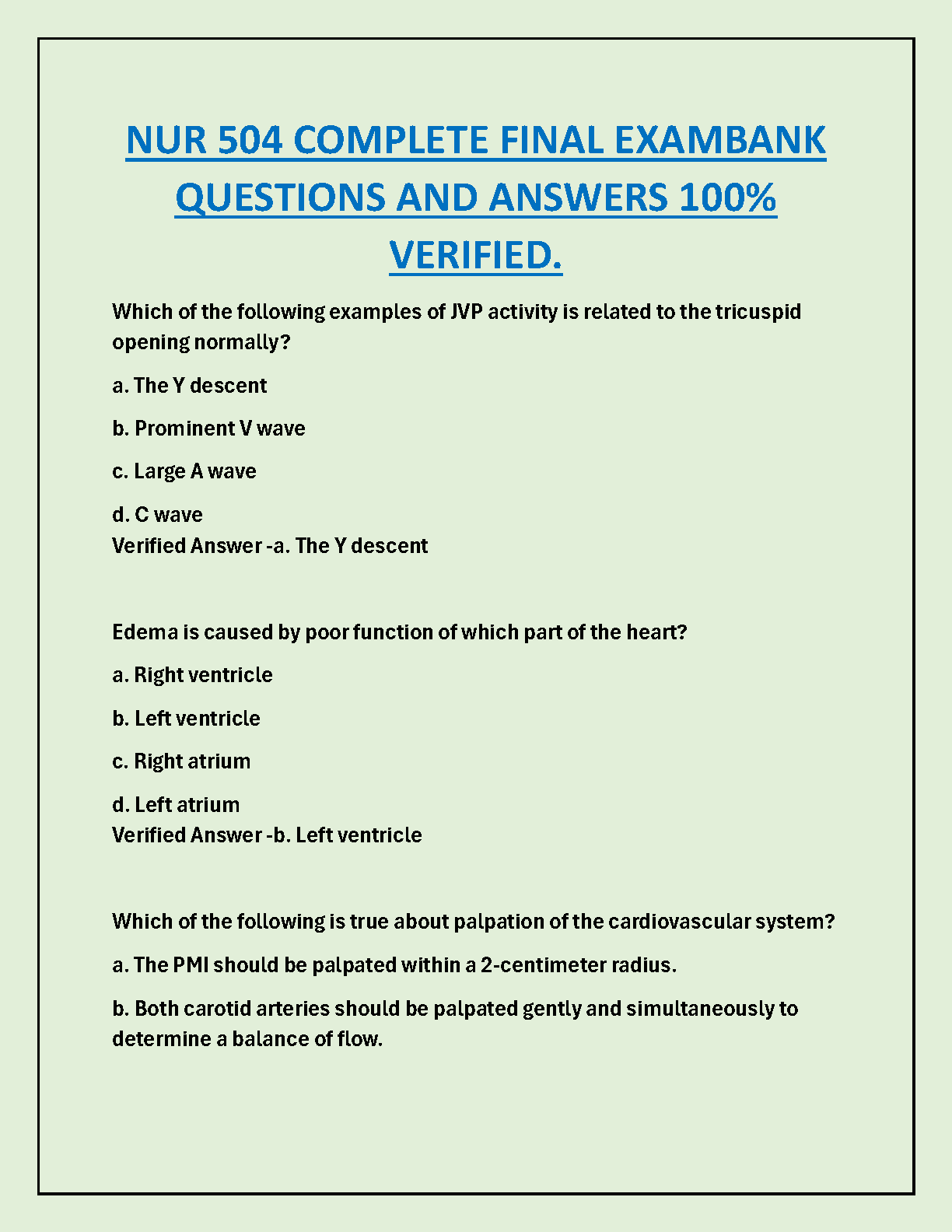 Ace your NUR 504 final exam with this comprehensive exam bank featuring 100% verified questions and answers. This 2024-2025 edition is designed to help students pass on their first try, avoiding costly resits. Master key concepts and boost your confidence with this invaluable resource.