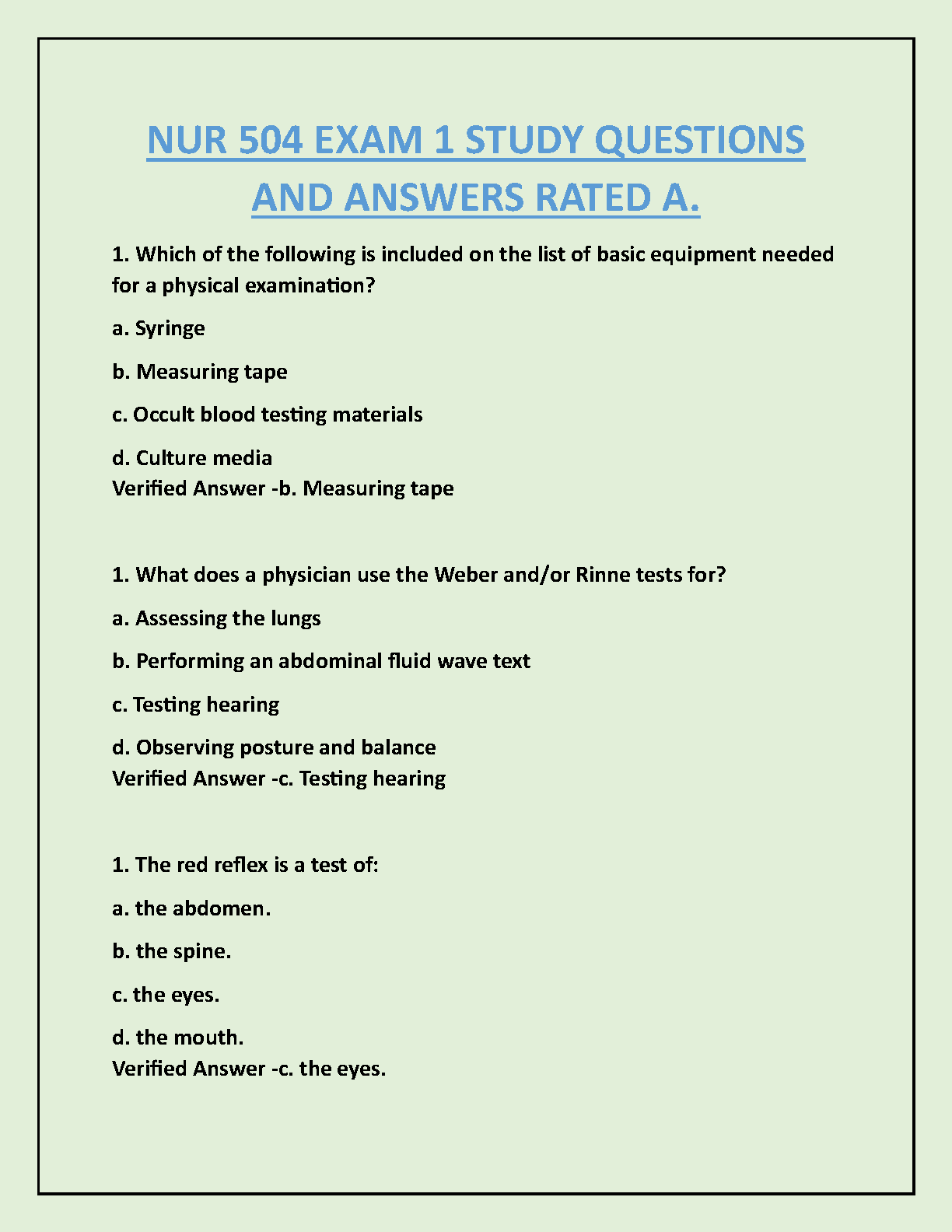 Ace your NUR 504 Exam 1 with this comprehensive study guide, featuring verified answers rated A. Designed to help students pass their exams on the first attempt and avoid resits. This resource provides a focused approach to mastering key concepts.