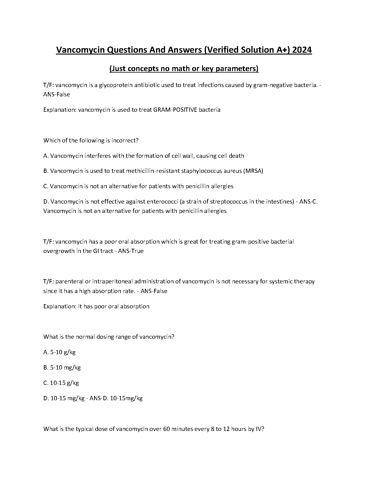Vancomycin Questions and Answers (Verified Solution A+) 2024 by [Author Names Unavailable]