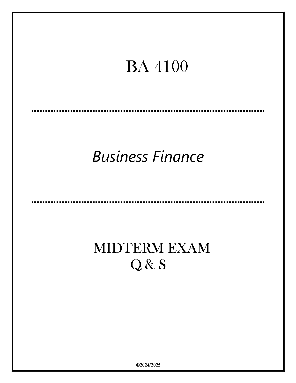 This comprehensive guide provides answers and solutions for the BA 4100 Business Finance midterm exam, designed to help students achieve exam success. Perfect for the 2024-2025 academic year, this resource is your key to avoiding resits and achieving top grades.