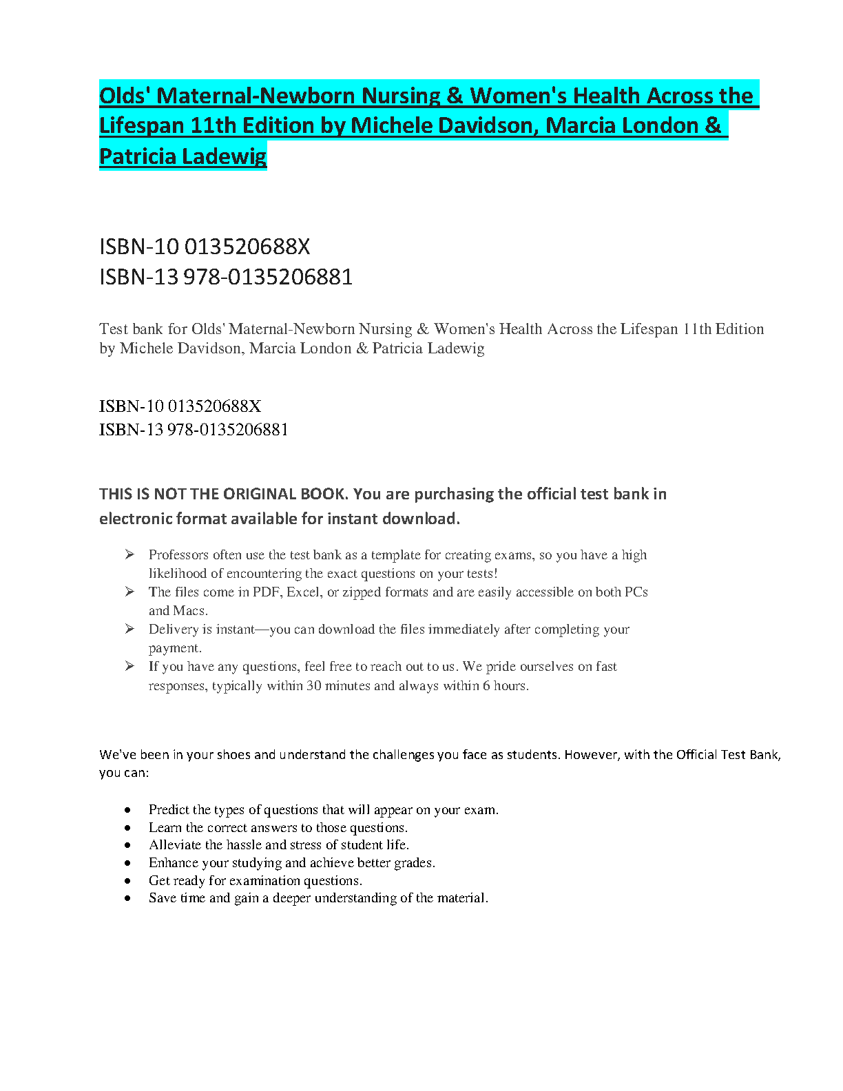 Olds' Maternal-Newborn Nursing and Women's Health Across the Lifespan, 11th Edition Test Bank by Michele Davidson, Marcia London, and Patricia Ladewig