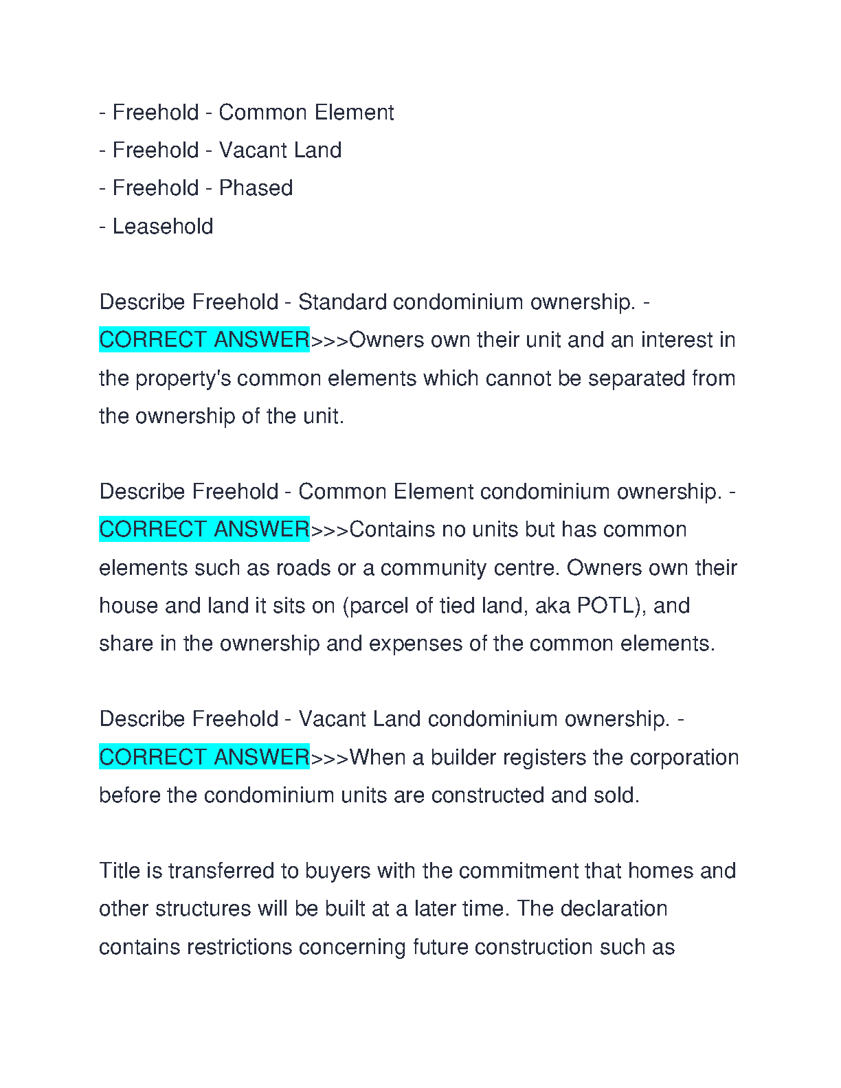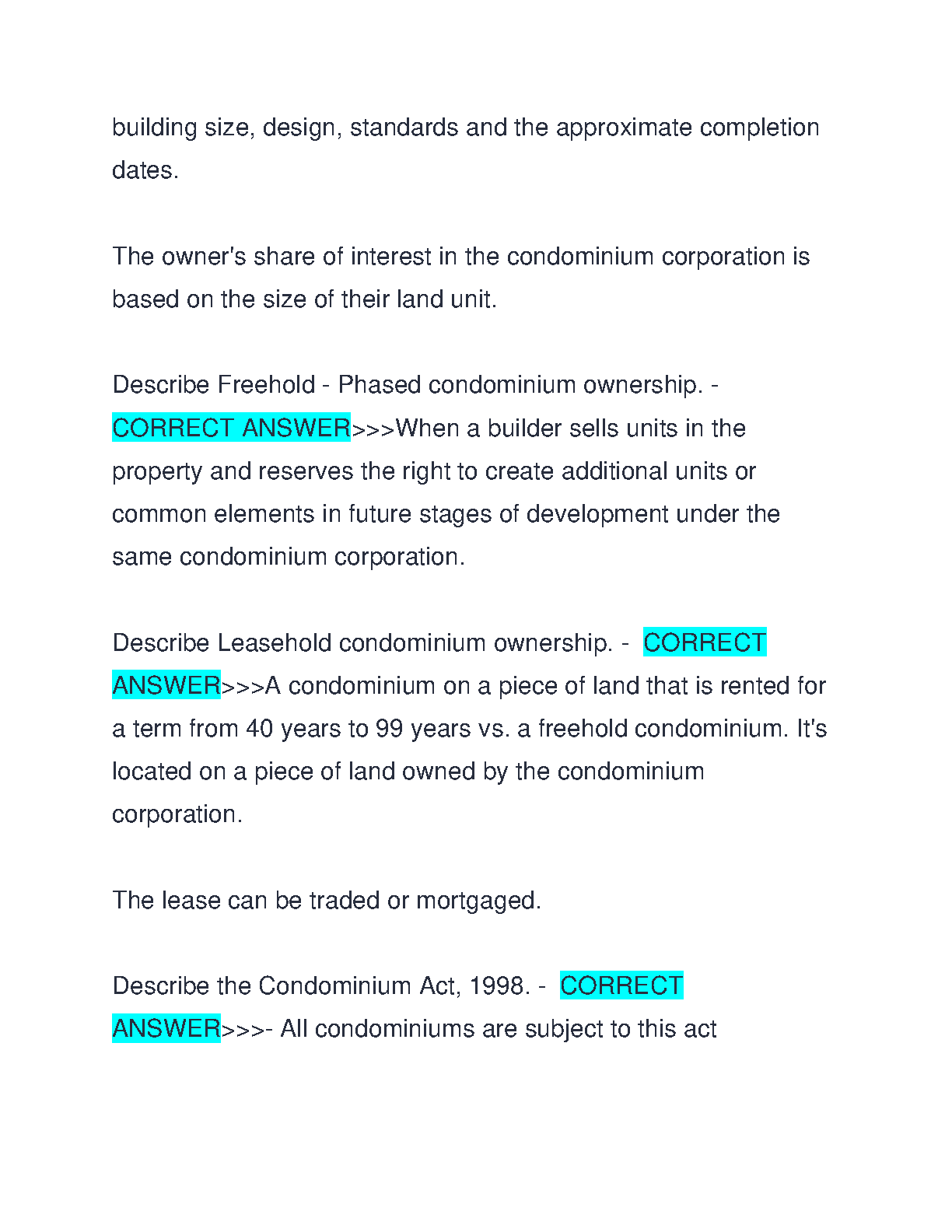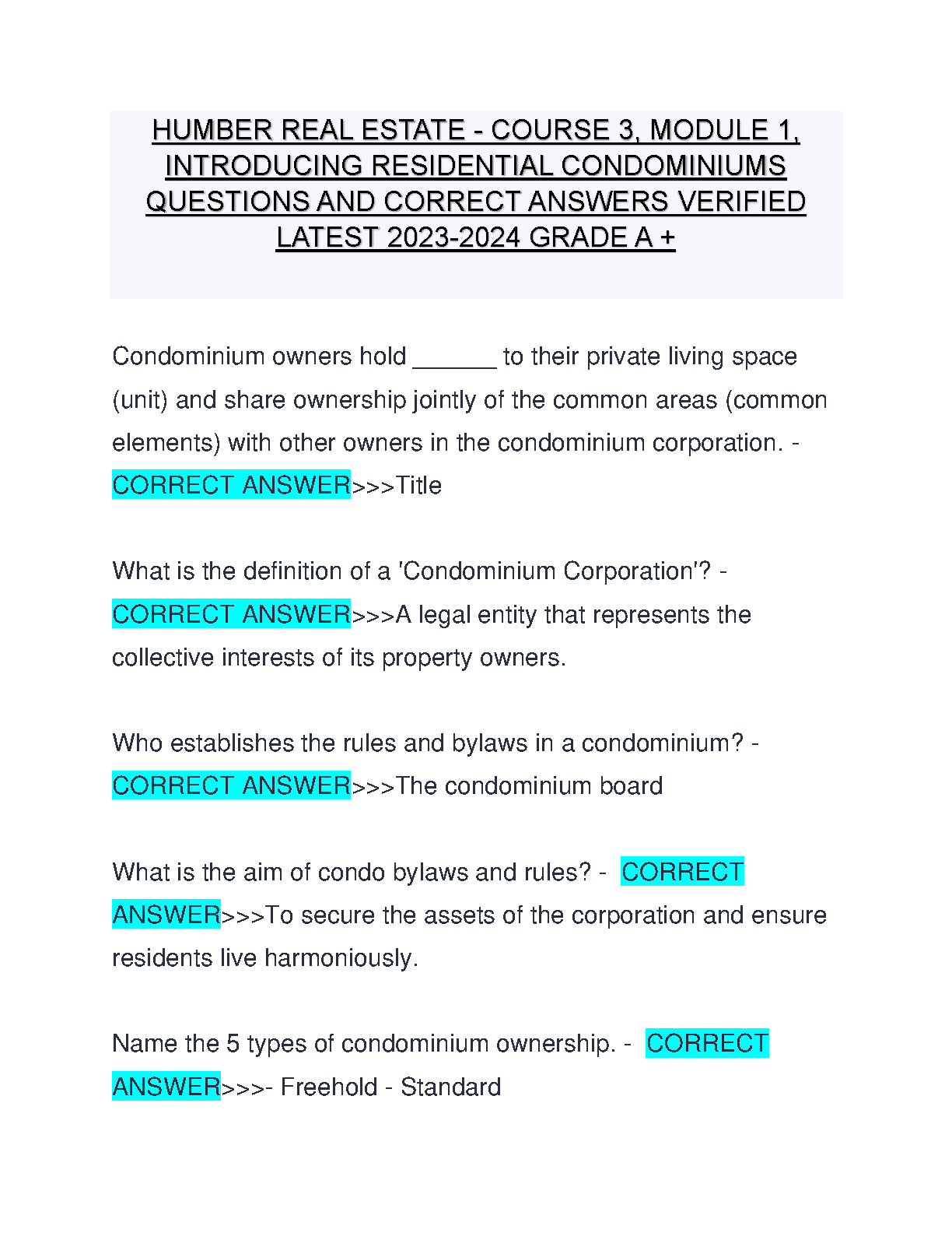 Humber Real Estate - Course 3, Module 1: Introducing Residential Condominiums - Questions and Answers Verified (2023-2024 Edition)