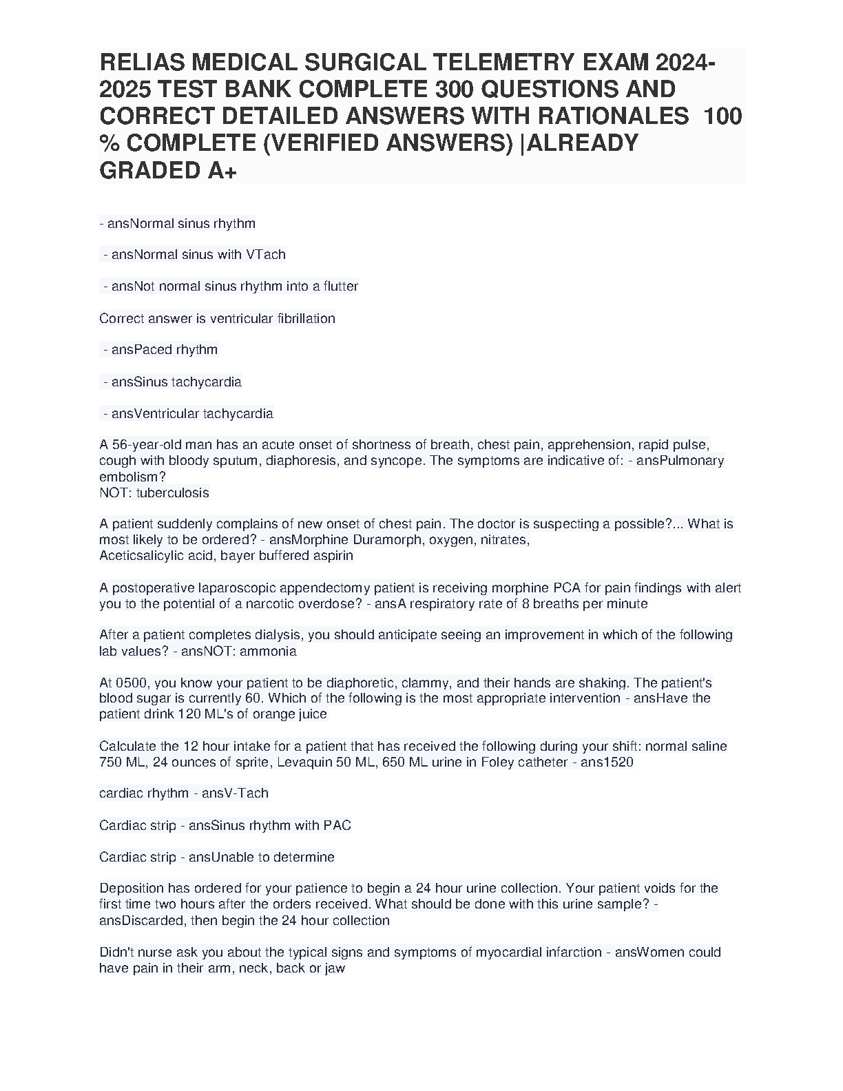 Ace your Relias Medical Surgical Telemetry Exam with this comprehensive test bank. Includes 300 detailed questions and answers with rationales, verified answers, and already graded for A+. Perfect for first-time exam takers aiming to pass on their first attempt.