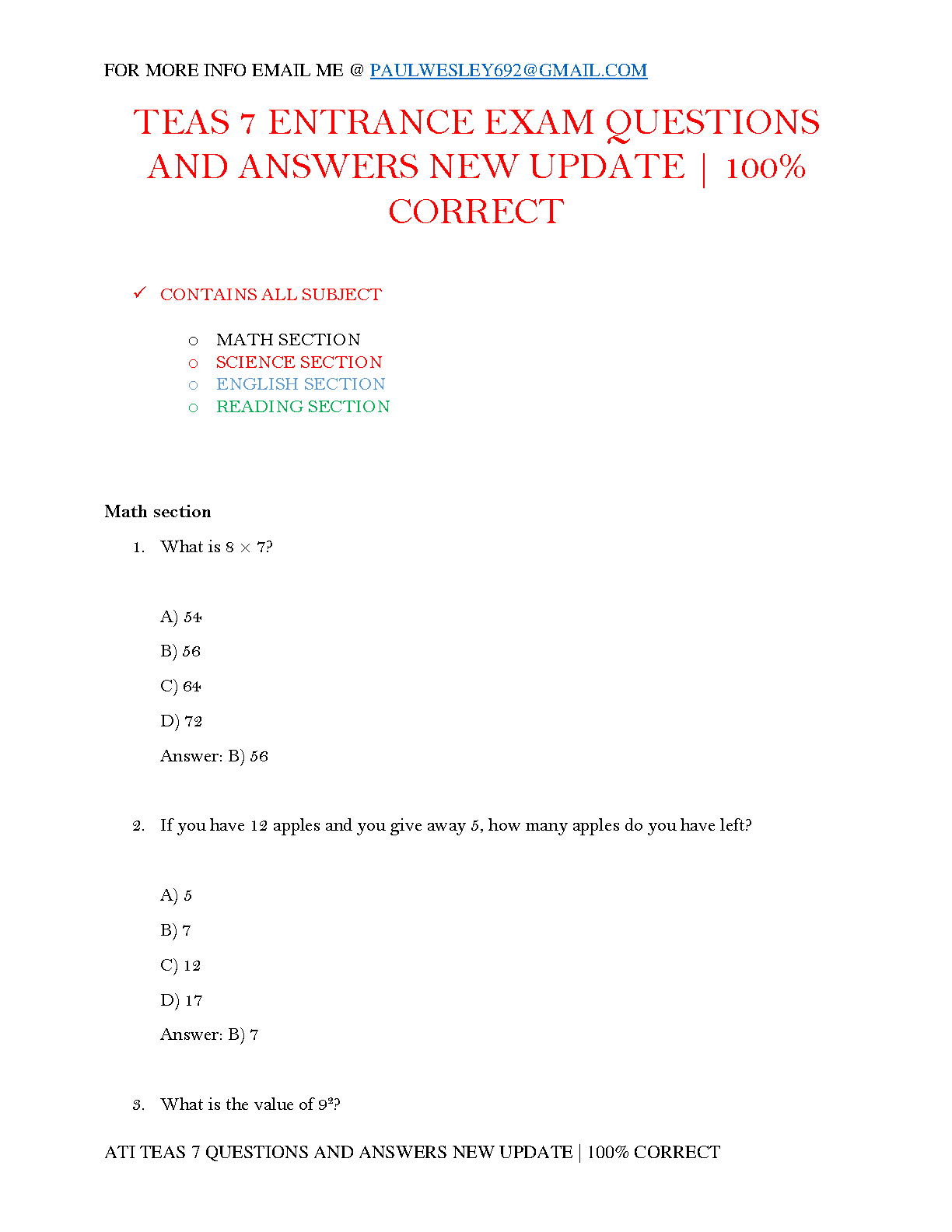 Ace your TEAS 7 exam on your first try with this comprehensive guide. This updated 2024/2025 resource includes practice questions and answers covering all sections: Math, Science, English, and Reading. Guaranteed to boost your confidence and help you avoid resits.