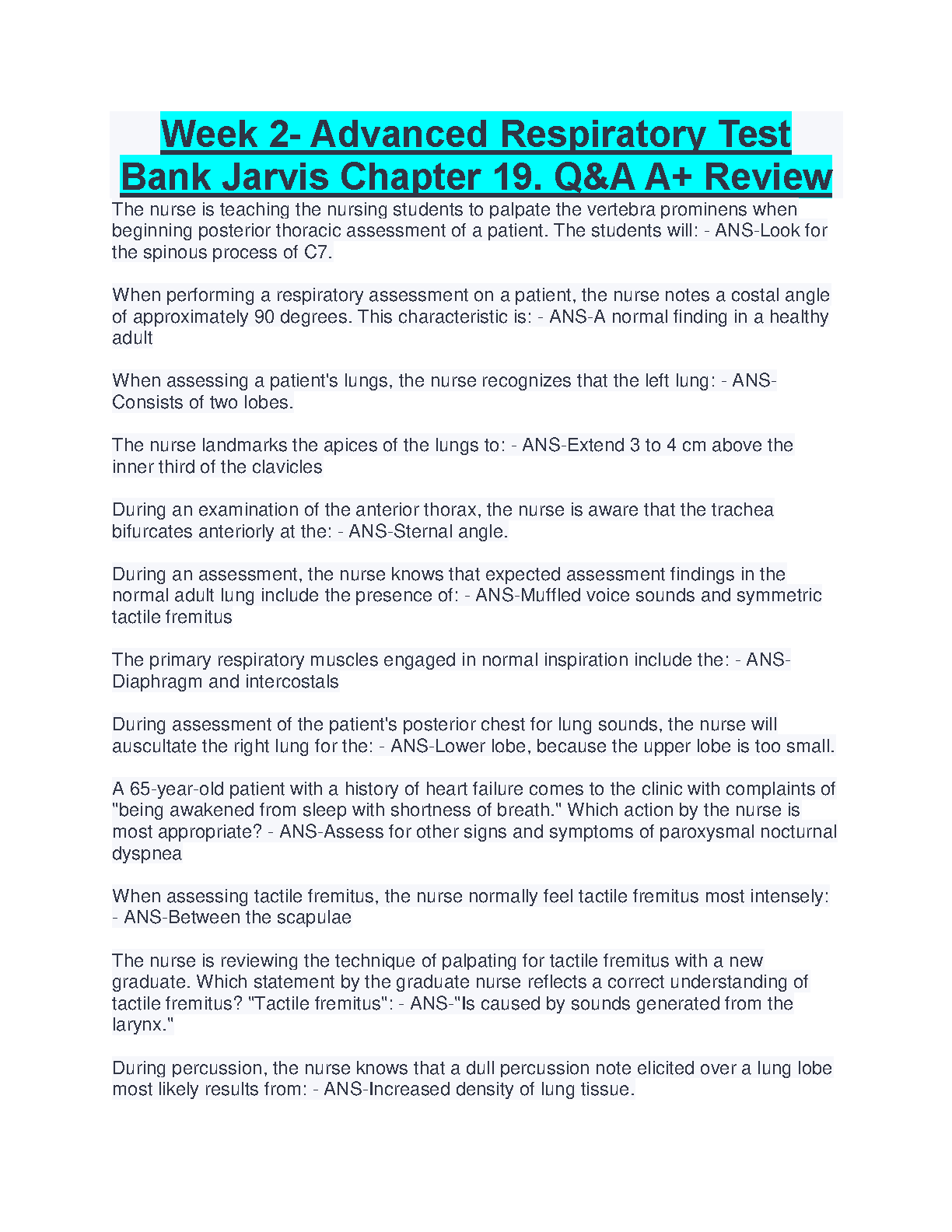 Week 2- Advanced Respiratory Test Bank: Jarvis Chapter 19 Q&A A+ Review by Unknown Author