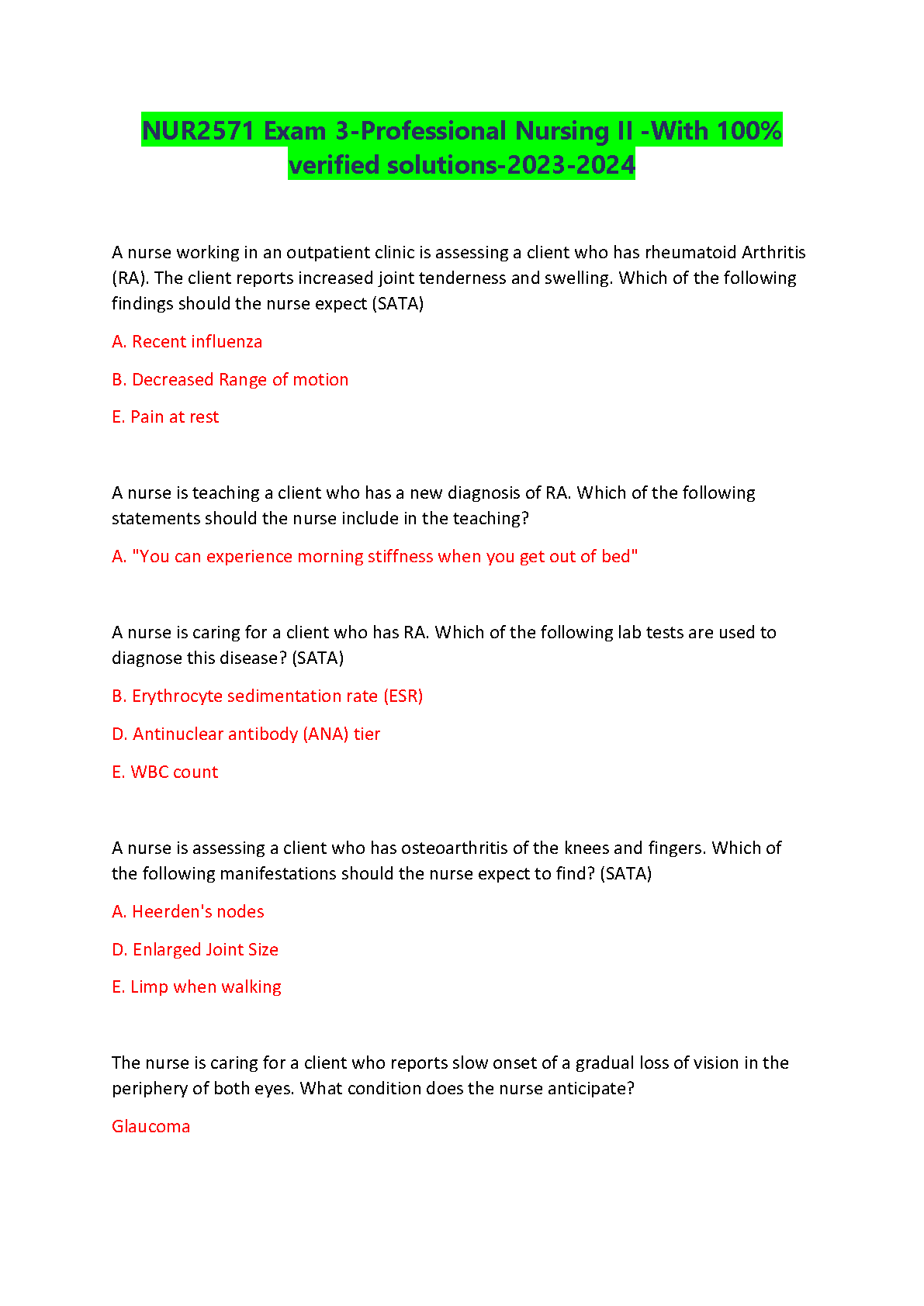 NUR2571 Exam 3: Professional Nursing II - 100% Verified Solutions 2023-2024 by [Author Names not found in the provided text]