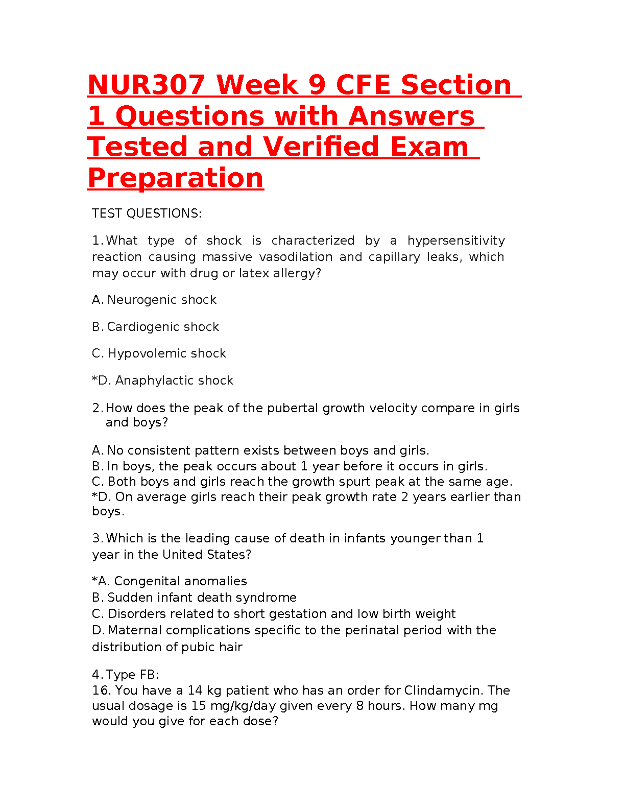 NUR307 Week 9 CFE Section 1 Questions with Answers: A Comprehensive Exam Preparation Guide