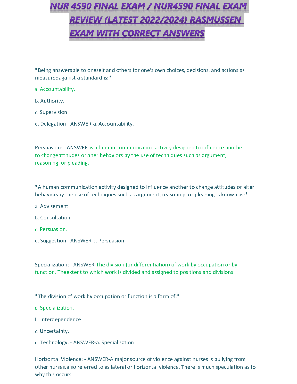 NUR 4590 Final Exam Review (Latest 2022/2024) Rasmussen - Exam with Correct Answers