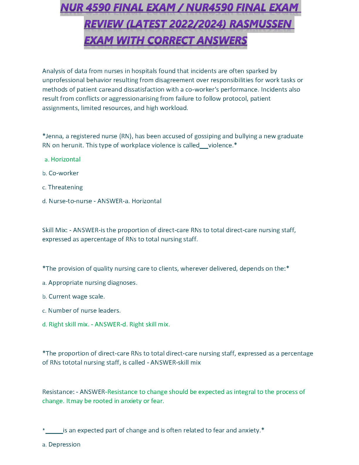 Ace your Rasmussen NUR 4590 final exam with this comprehensive review guide featuring accurate answers. This updated resource covers the latest 2022-2024 material, ensuring you're fully prepared to pass on your first attempt and avoid resits.