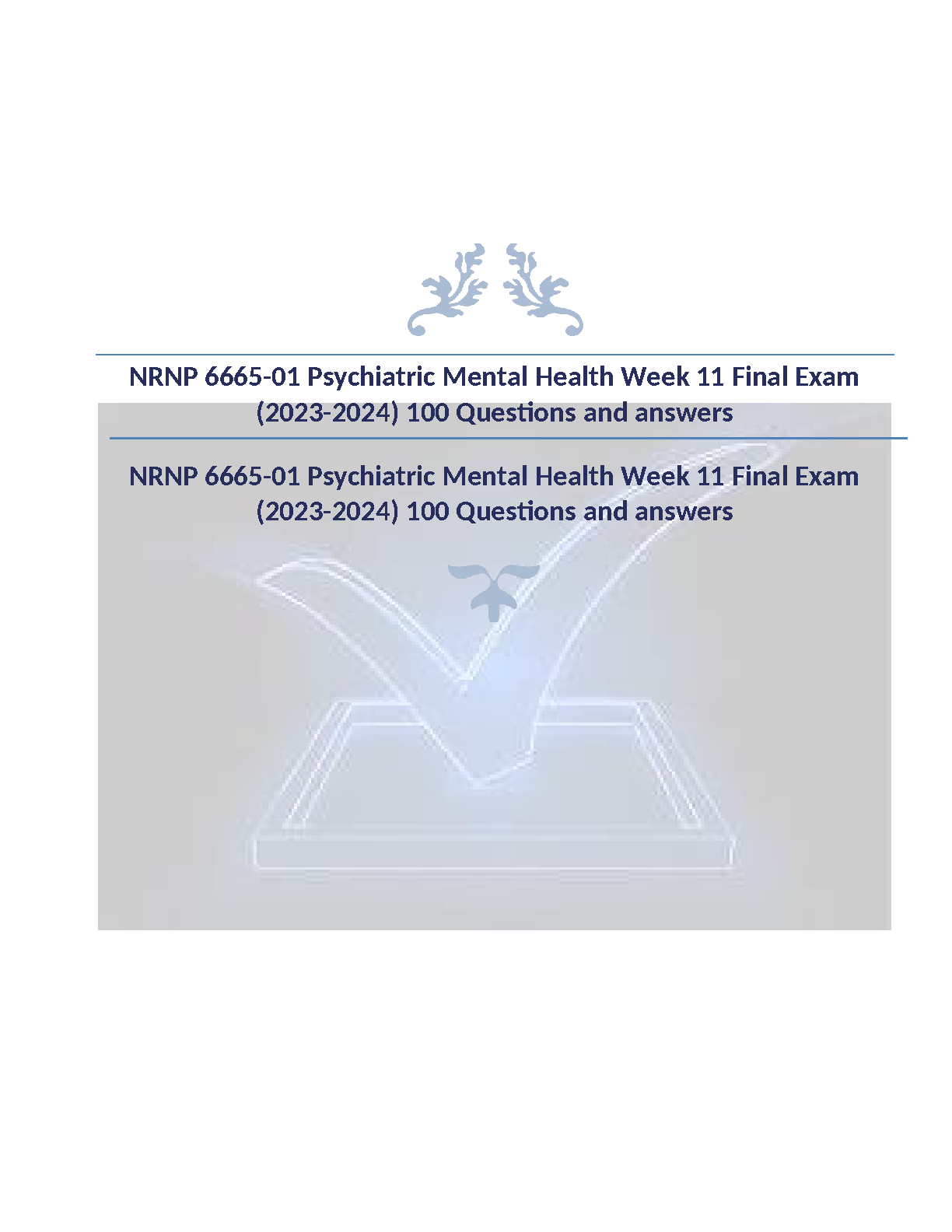 NRNP 6665-01 Psychiatric Mental Health Week 11 Final Exam (2023-2024): 100 Questions and Answers by Unknown Author