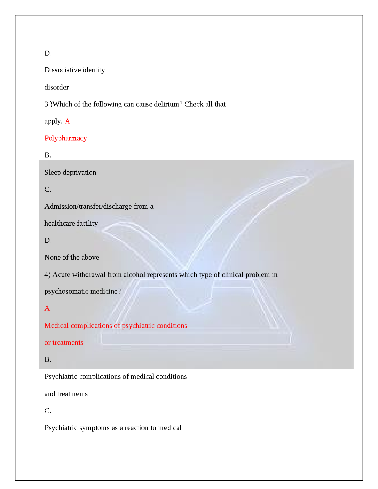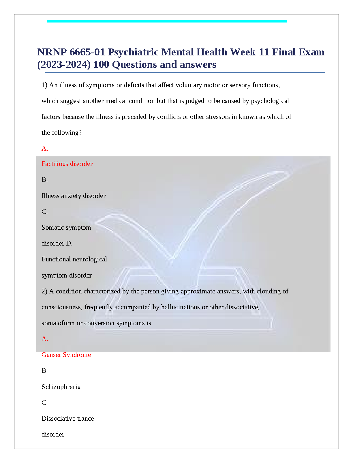 Ace your NRNP 6665-01 Psychiatric Mental Health Week 11 final exam with this comprehensive study guide. Featuring 100 questions and answers covering key concepts from the 2023-2024 academic year, this resource is designed to help students pass their exams on the first attempt and avoid resits.