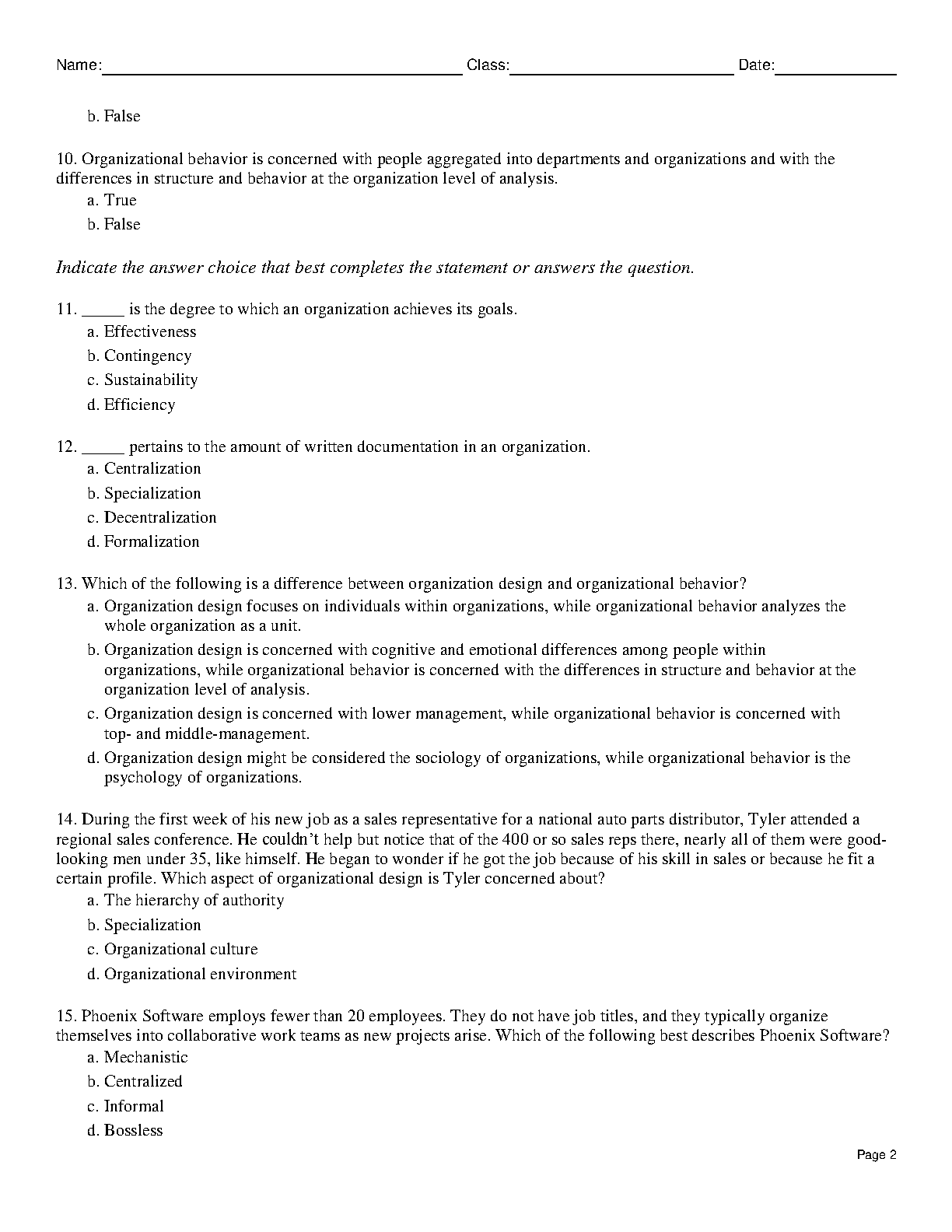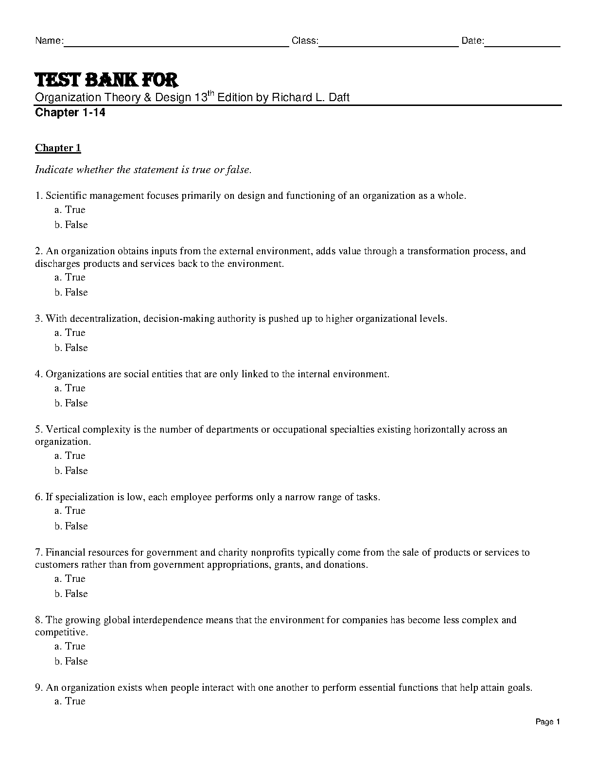 This is a test bank for the 13th edition of Richard L. Daft's Organization Theory & Design. It contains numerous true/false questions to help students prepare for exams and improve their understanding of organizational theory and design. Ideal for acing your exams on the first attempt.