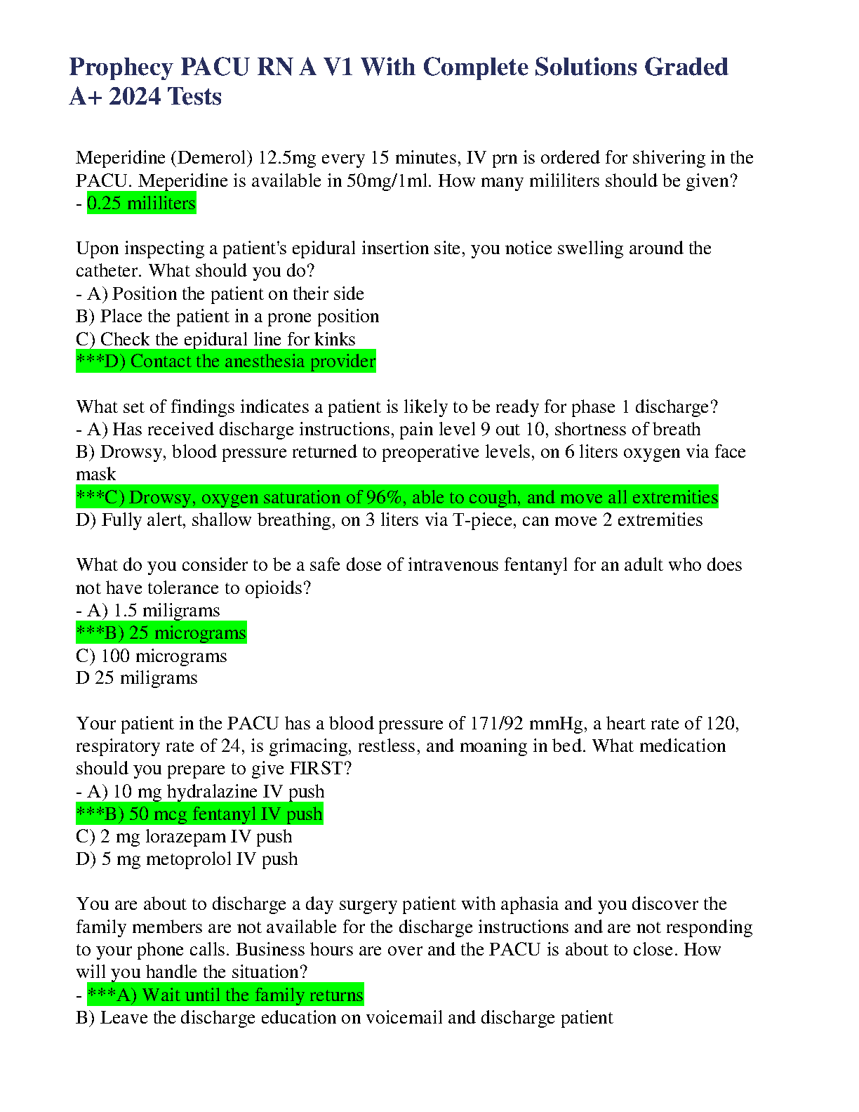Prophecy PACU RN A V1 Complete Solutions: 2024 Edition by Prophecy Health