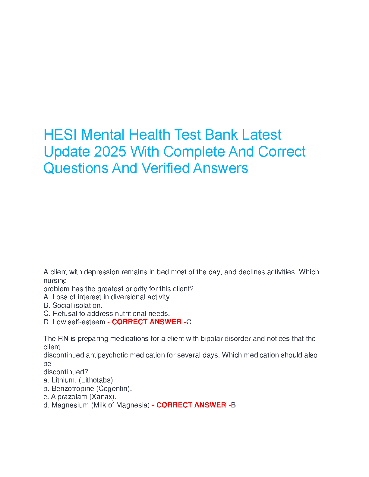 HESI Mental Health Test Bank 2025 Edition: Complete Questions and Verified Answers