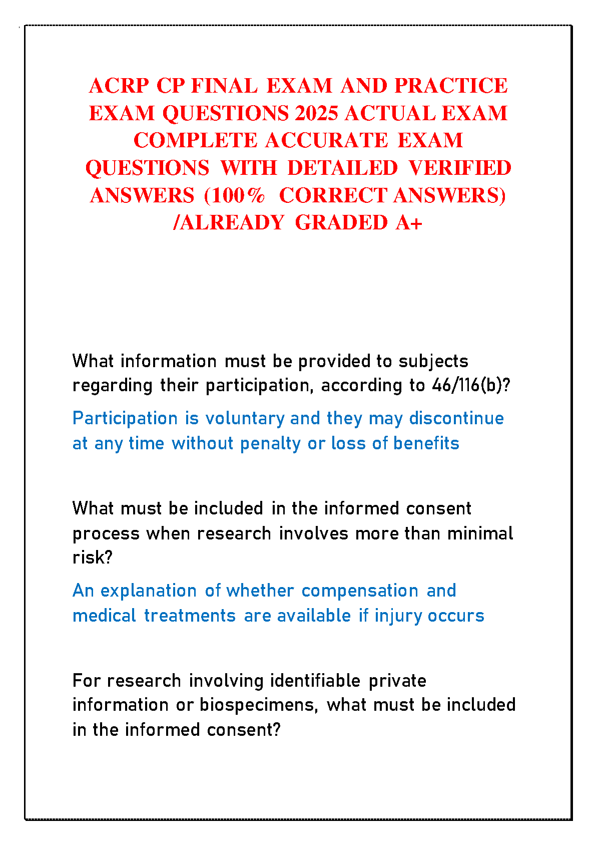 ACRP CP Final Exam and Practice Exam Questions 2025: Complete Accurate Exam Questions with Detailed Verified Answers (100% Correct Answers) by [Author Names]