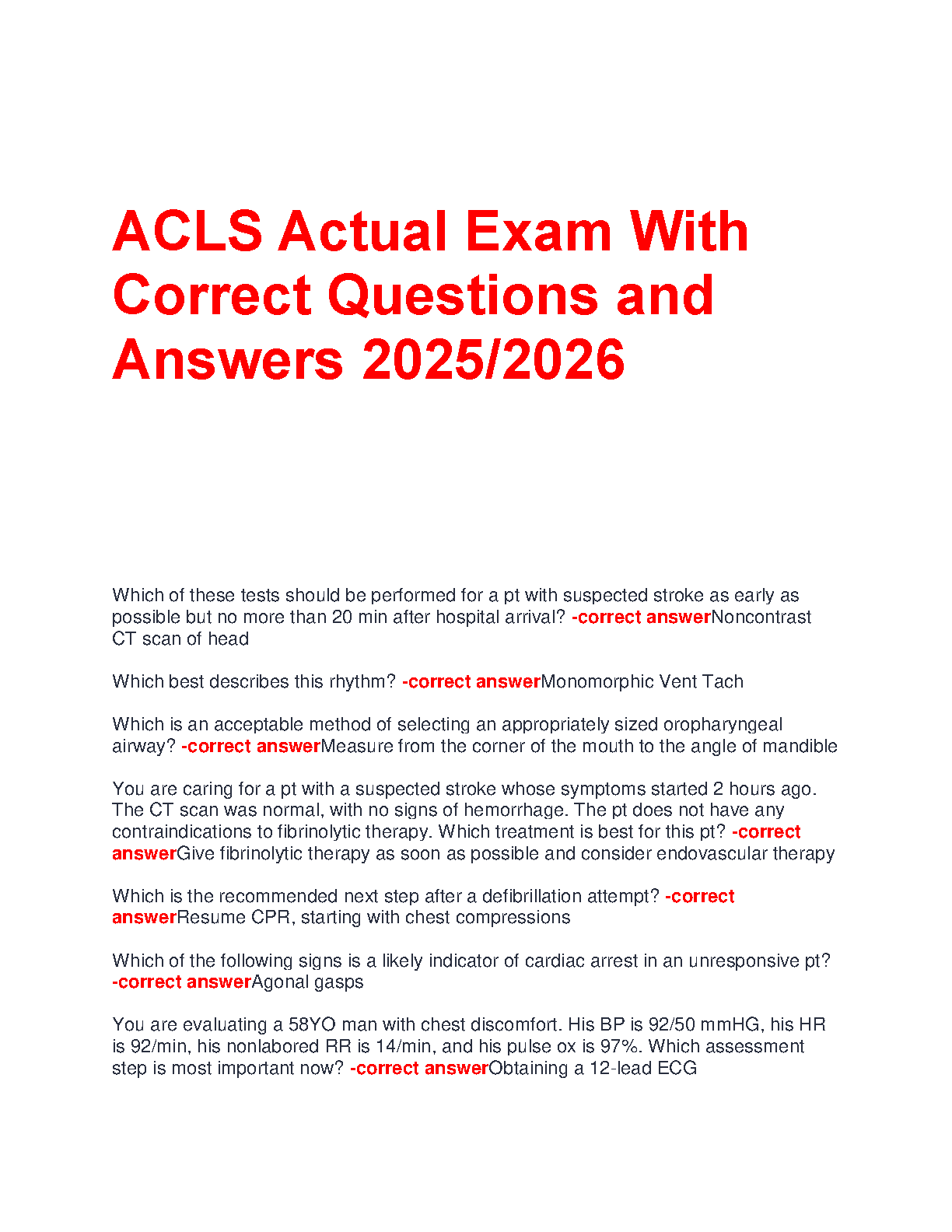 ACLS Actual Exam With Correct Questions and Answers 2025/2026
