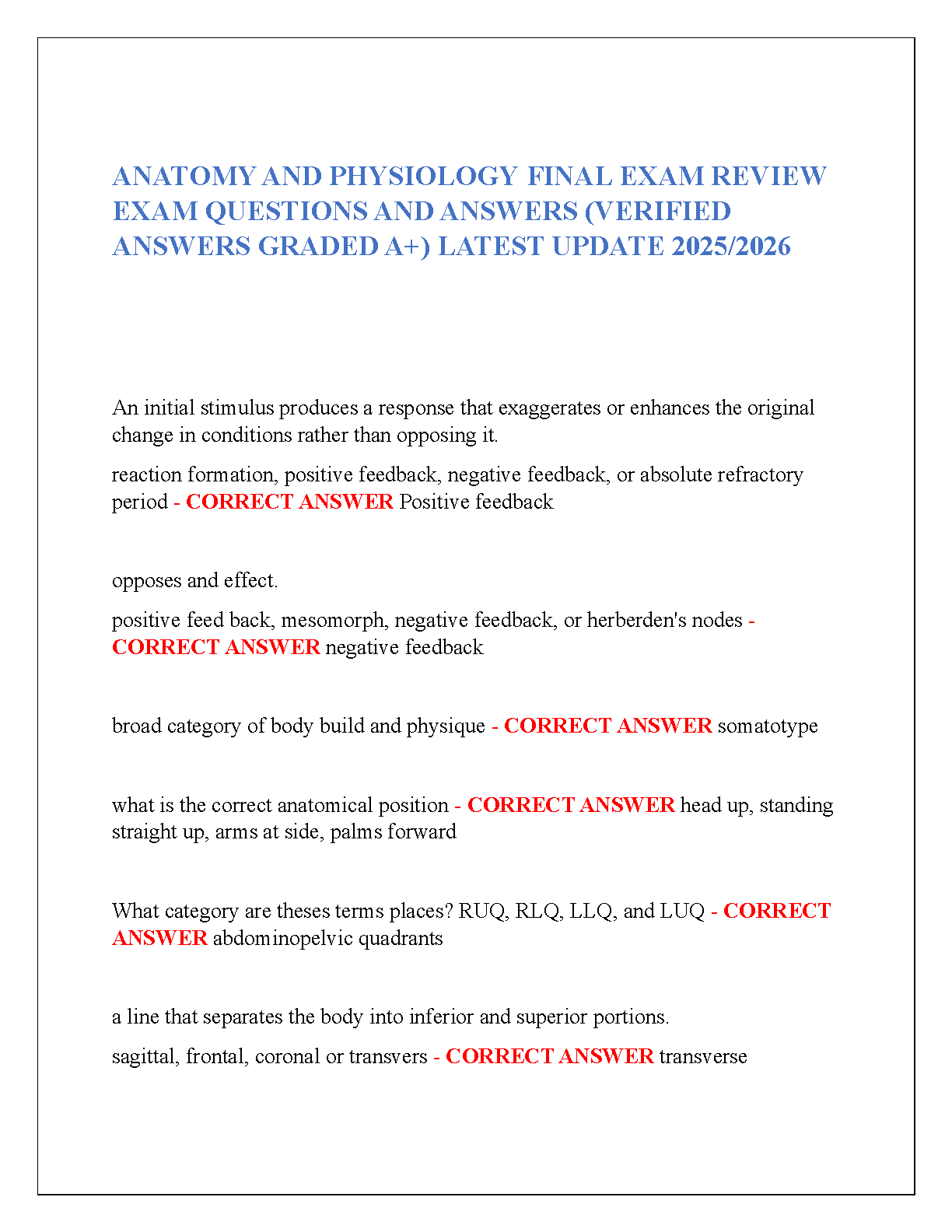 Anatomy and Physiology Final Exam Review Questions and Answers 2025/2026 Edition by [Author's name not found]