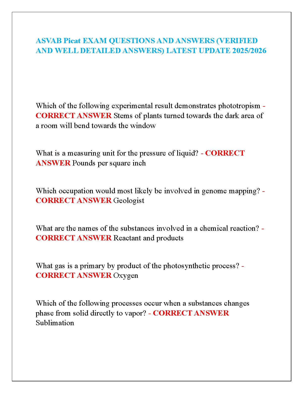 ASVAB Picat Exam Questions and Answers 2025/2026 Edition: A Comprehensive Guide to Exam Success