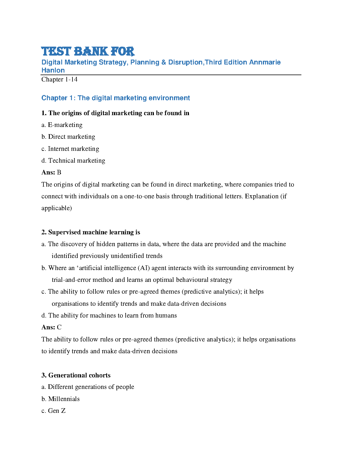 Ace your Digital Marketing exams with this comprehensive test bank for Annmarie Hanlon's "Digital Marketing Strategy, Planning & Disruption", Third Edition. This resource is designed to help students master the material and achieve exam success on their first attempt, avoiding resits. Prepare thoroughly and confidently.