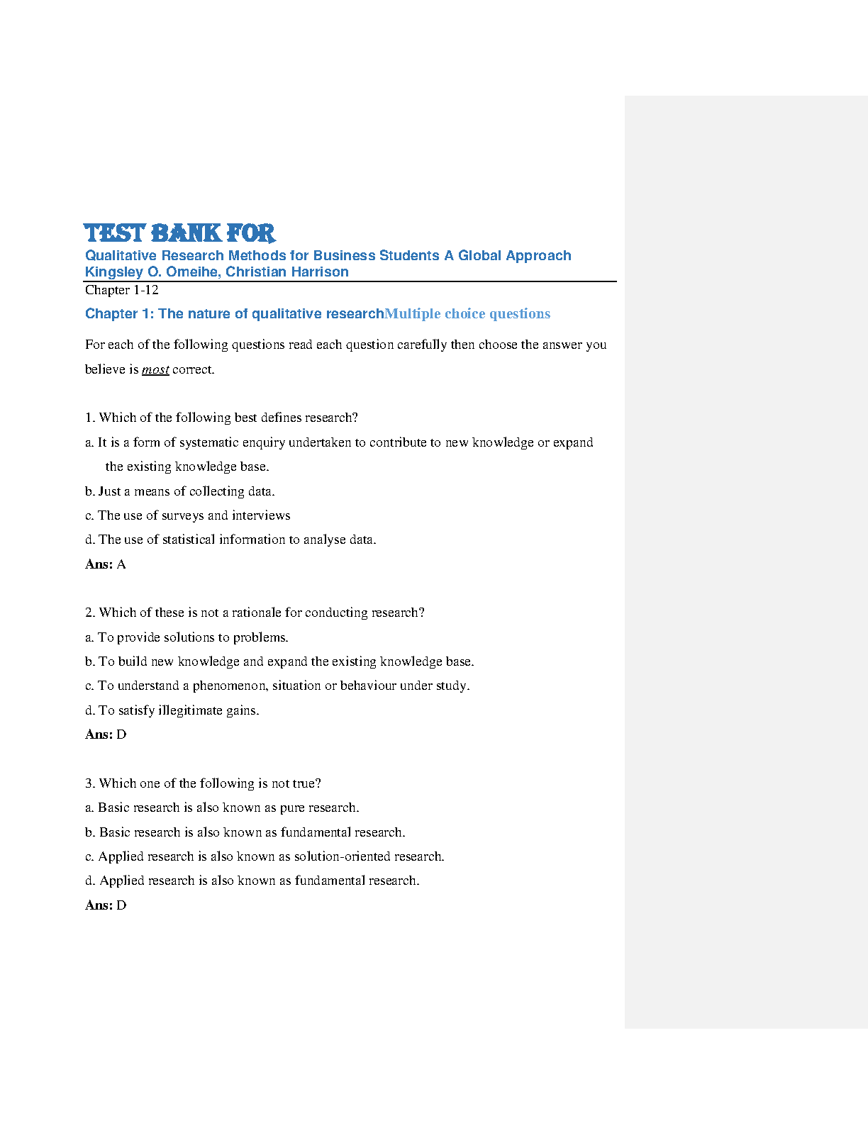 Ace your exams on the first try with this comprehensive test bank for Qualitative Research Methods for Business Students: A Global Approach. This resource is designed to help students master the concepts and prepare effectively for exams, minimizing the risk of resits. It covers all chapters, providing multiple choice questions and answers.