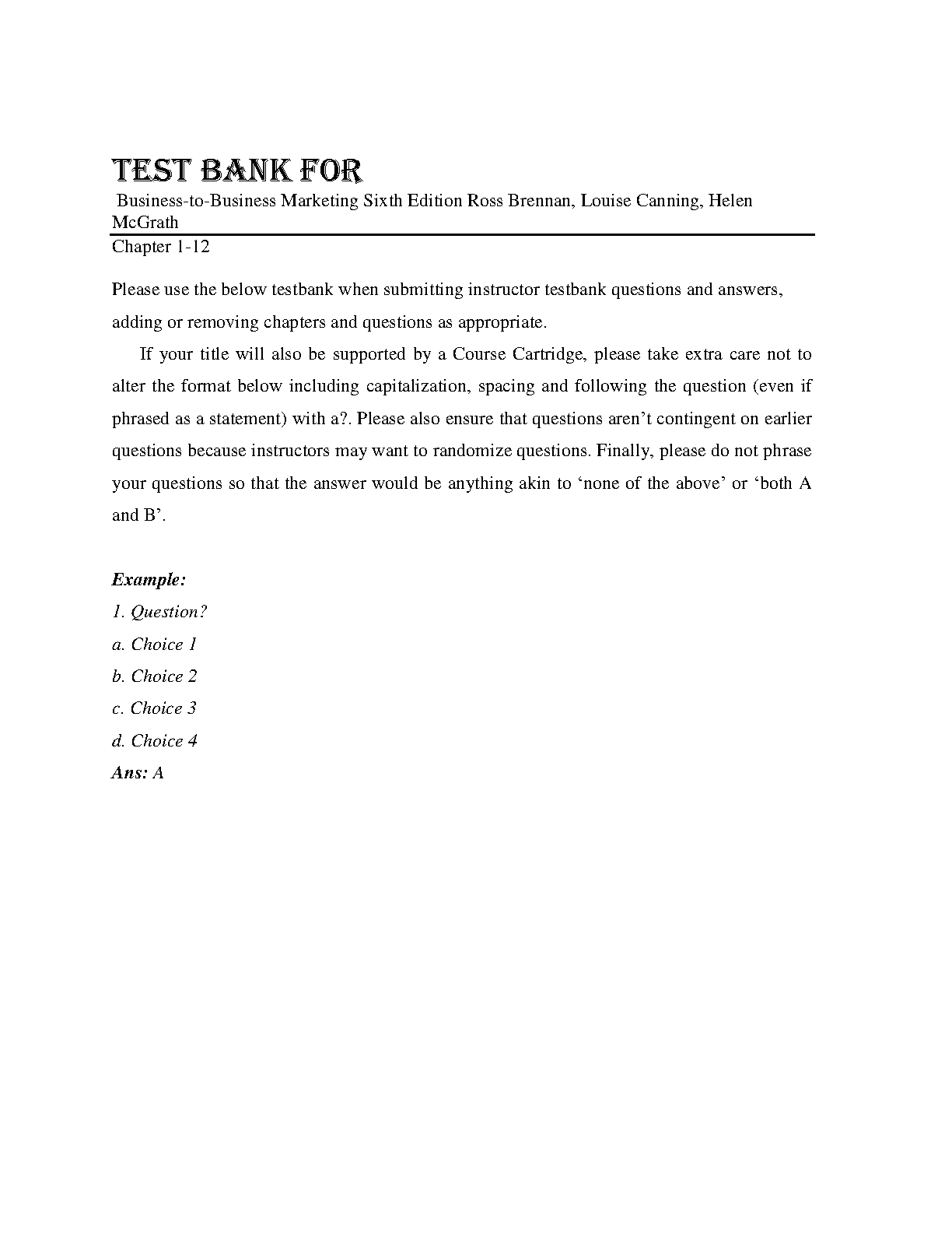 Ace your Business-to-Business Marketing exams with this comprehensive test bank, covering all chapters (1-12) of the Sixth Edition by Ross Brennan, Louise Canning, and Helen McGrath. Prepare effectively and avoid resits.