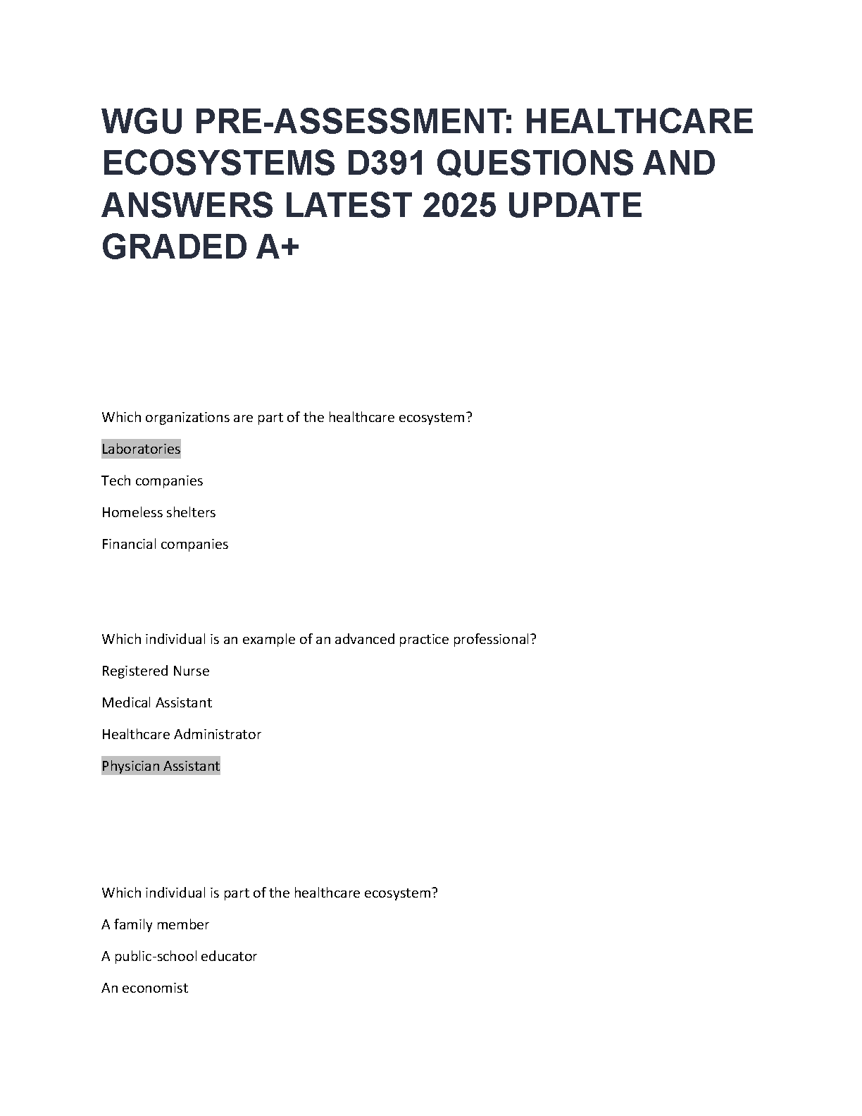 WGU D391 Healthcare Ecosystems Pre-Assessment Questions and Answers: Latest 2025 Update Graded A+