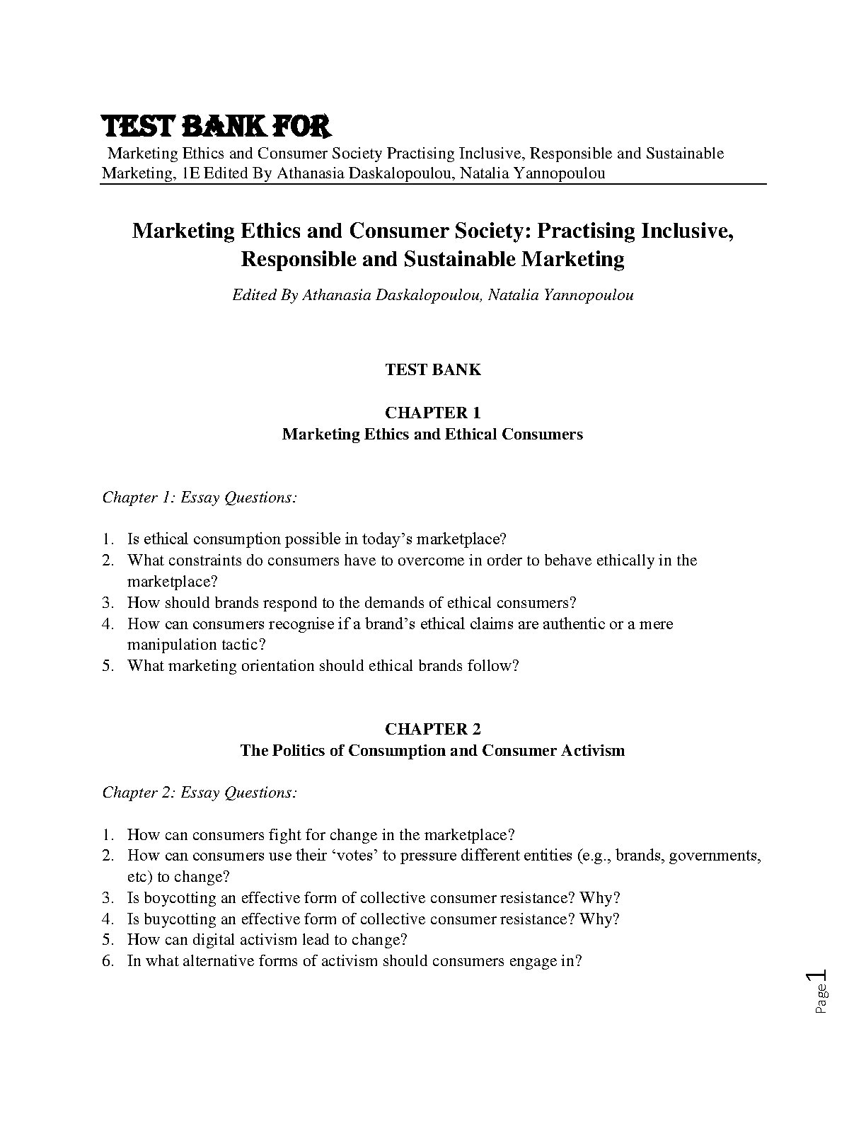 Test Bank for Marketing Ethics and Consumer Society: Practising Inclusive, Responsible and Sustainable Marketing, 1st Edition by Athanasia Daskalopoulou and Natalia Yannopoulou