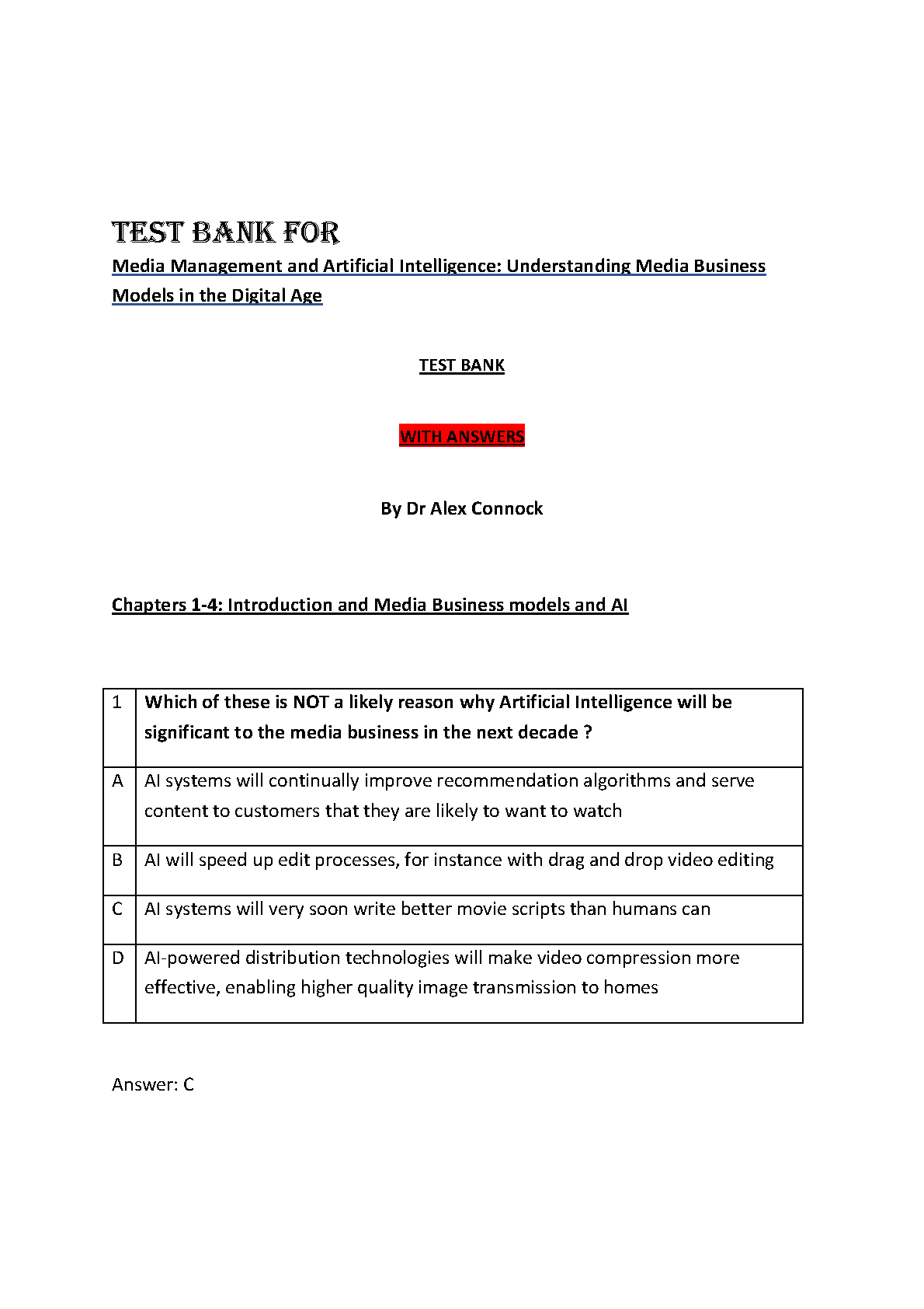 Test Bank with Answers for Media Management and Artificial Intelligence: Understanding Media Business Models in the Digital Age by Dr. Alex Connock