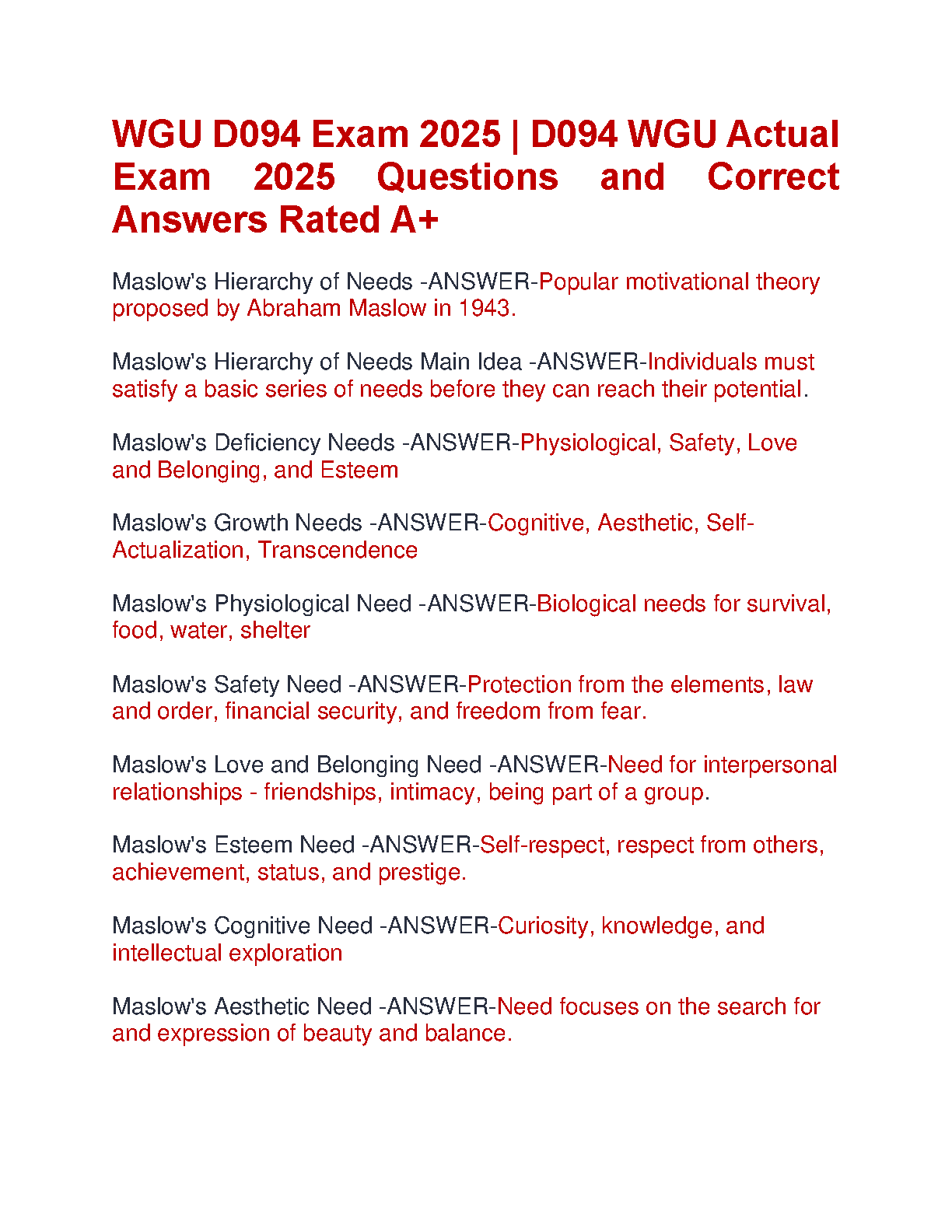 WGU D094 Exam 2025: Maslow's Hierarchy of Needs - Questions and Answers Rated A+ by [Author's Name if found, otherwise leave blank]