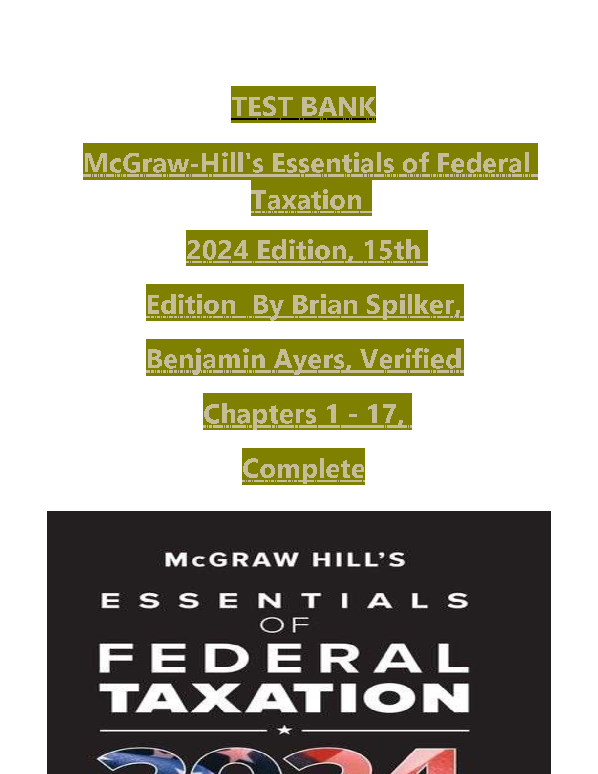 Ace your Federal Taxation exam with this comprehensive 2024/2025 test bank, covering all 17 chapters. Prepared by Brian Spilker and Benjamin Ayers, this resource guarantees first-attempt exam success. Avoid resits and boost your understanding with this verified and complete solution.
