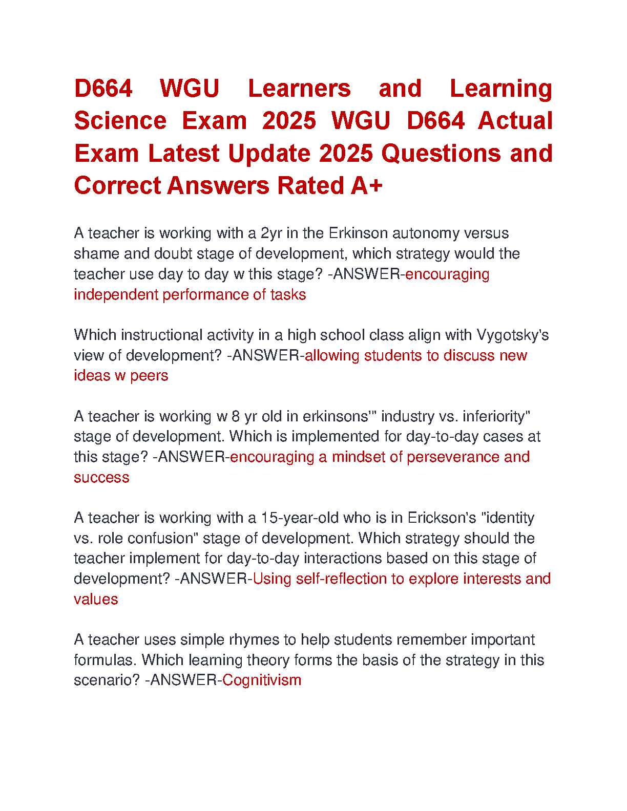 Ace your WGU D664 Learners and Learning Science Exam with this comprehensive guide. This updated 2025 edition provides actual exam questions and correct answers, ensuring you pass on your first attempt. Rated A+ for accuracy and effectiveness.