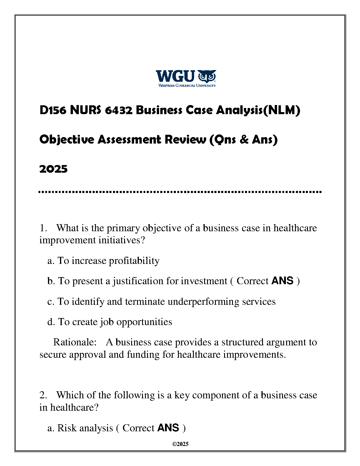WGU NURS 6432 Business Case Analysis (NLM) 2025 Edition: Objective Assessment Review with Questions and Answers