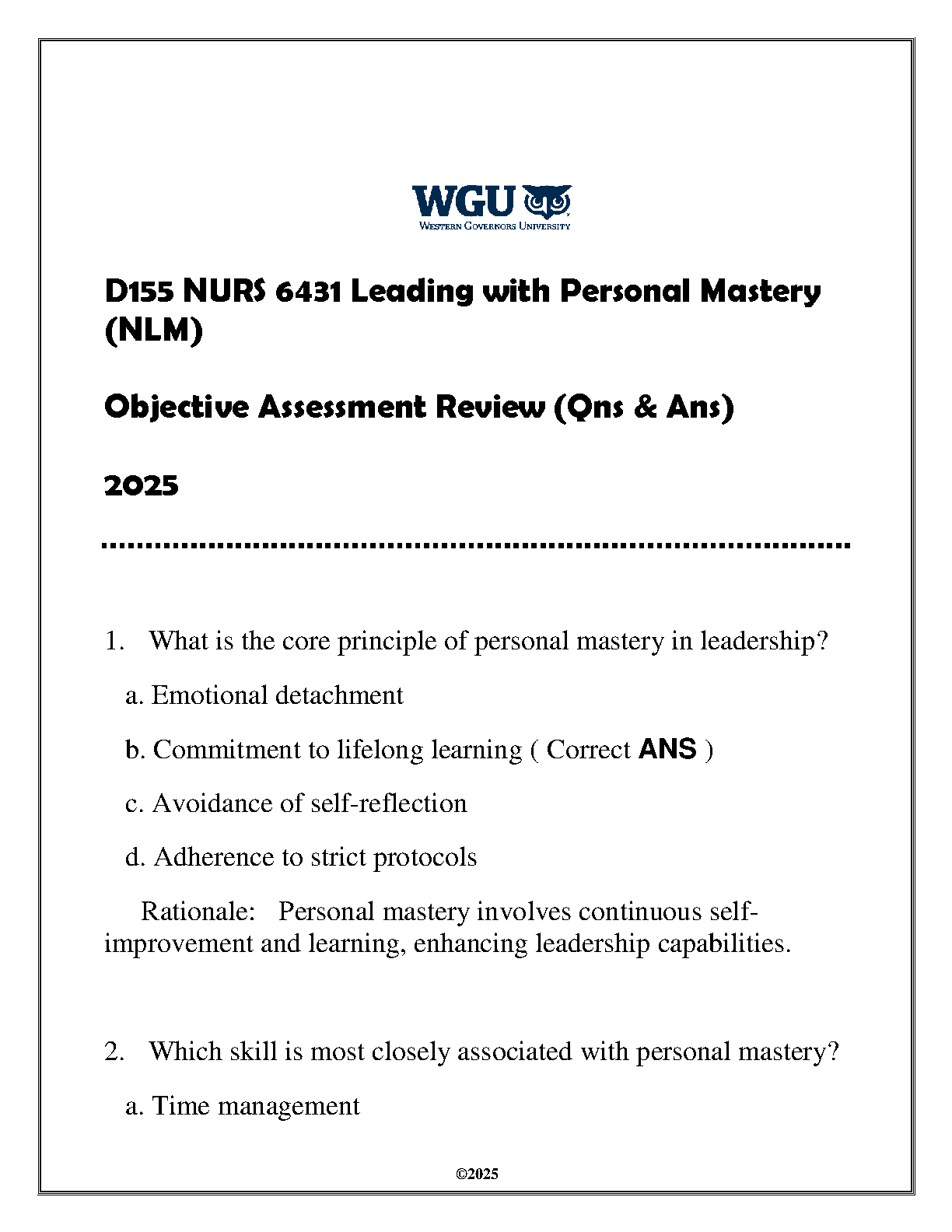 Ace your WGU D155 NURS 6431 Leading with Personal Mastery exam with this comprehensive 2025 objective assessment review. This resource features questions and answers designed to help students pass their exams on the first attempt, avoiding resits.