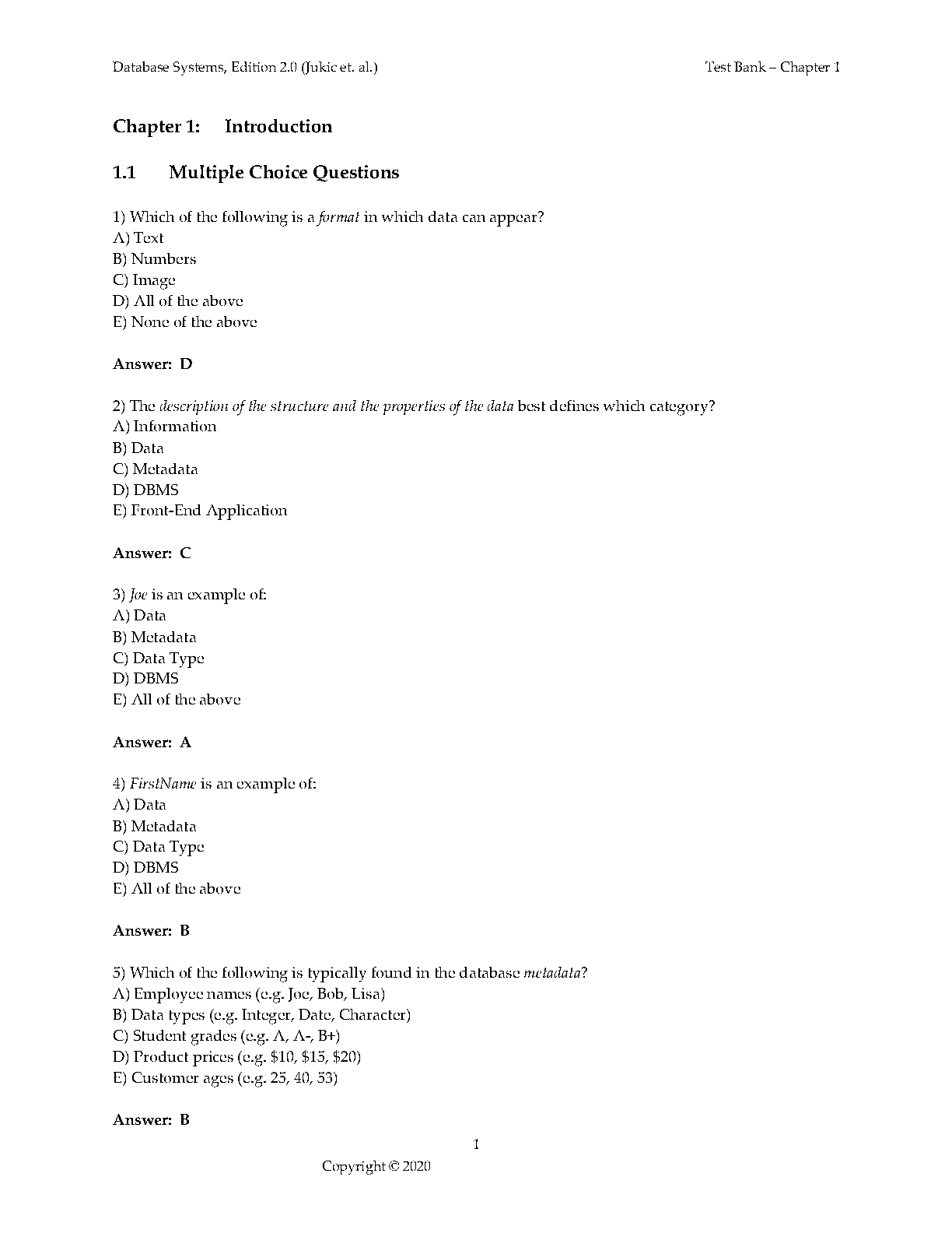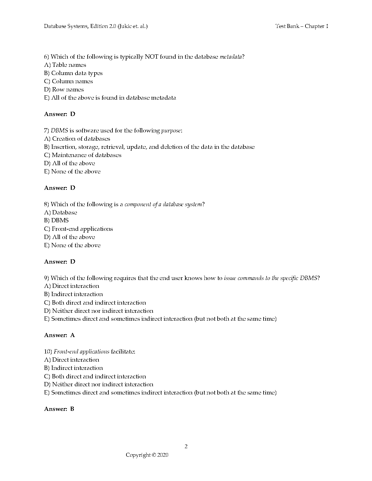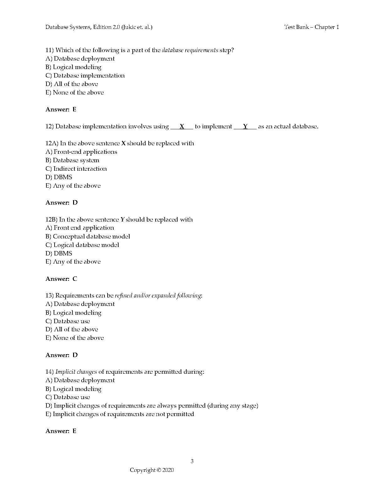 Ace your Database Systems exams with this comprehensive test bank for Jukic et al.'s Edition 2.0. This resource provides detailed answers and explanations, boosting your understanding and ensuring first-attempt success.