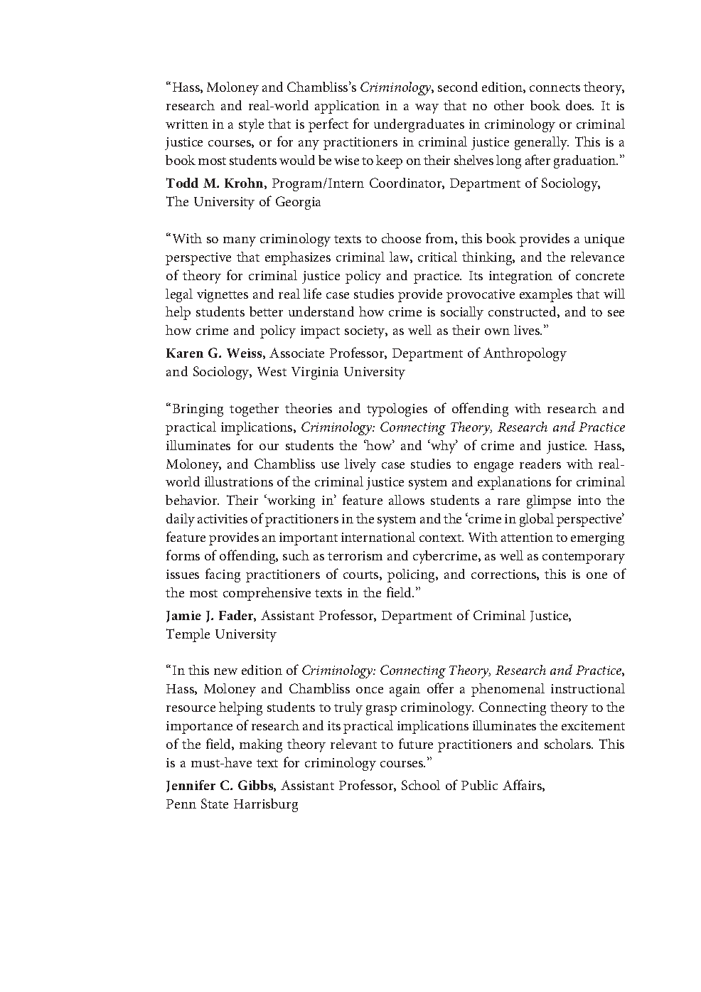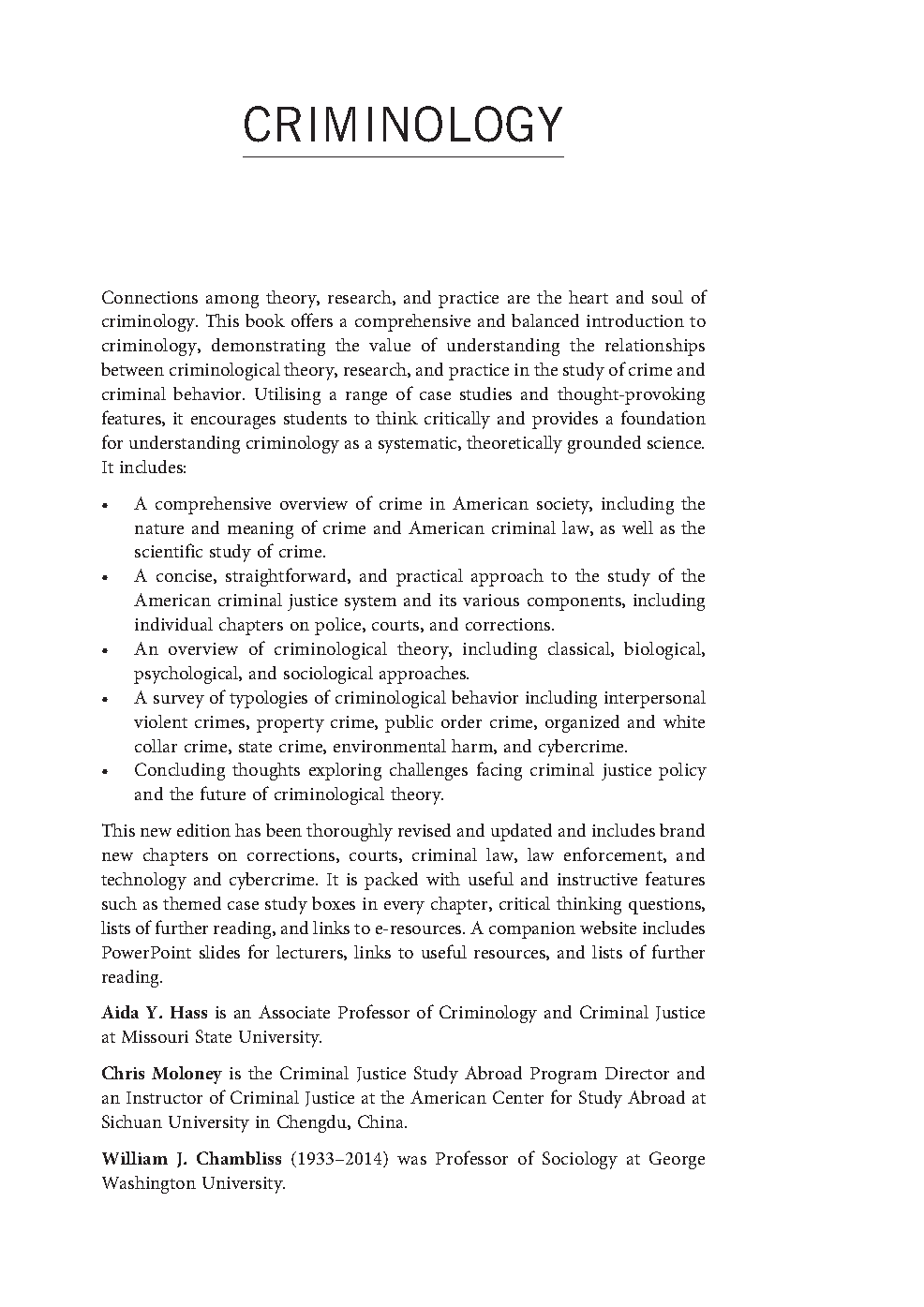 Master criminology with this comprehensive second edition textbook by Aida Y. Hass, Chris Moloney, and William J. Chambliss. Connecting theory, research, and practice, this resource provides a robust understanding of the field, helping students excel in their studies and pass exams on their first attempt.