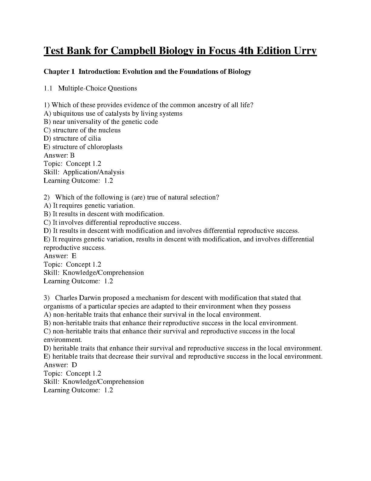 Campbell Biology in Focus 4th Edition Urry Test Bank by Lisa A. Urry, Michael L. Cain, Steven A. Wasserman, Peter V. Minorsky, Jane B. Reece