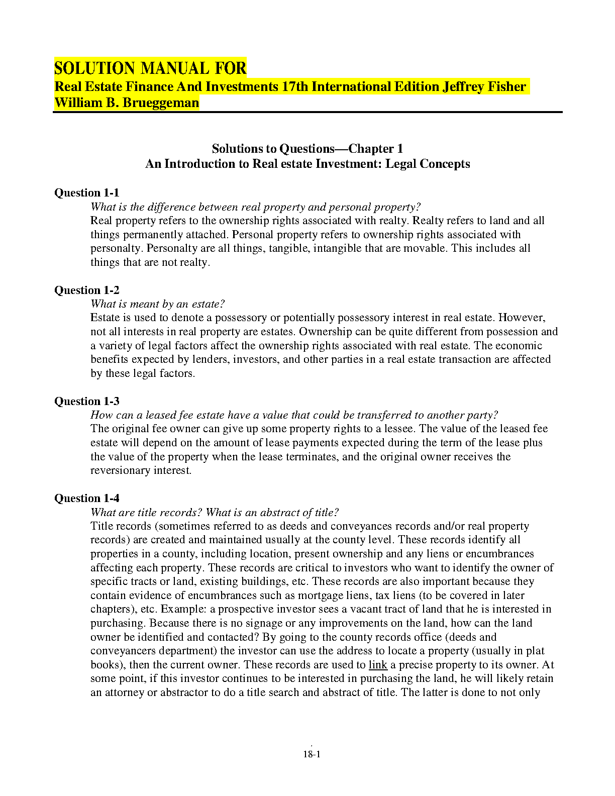 Solution Manual for Real Estate Finance and Investments, 17th International Edition by Jeffrey Fisher and William B. Brueggeman