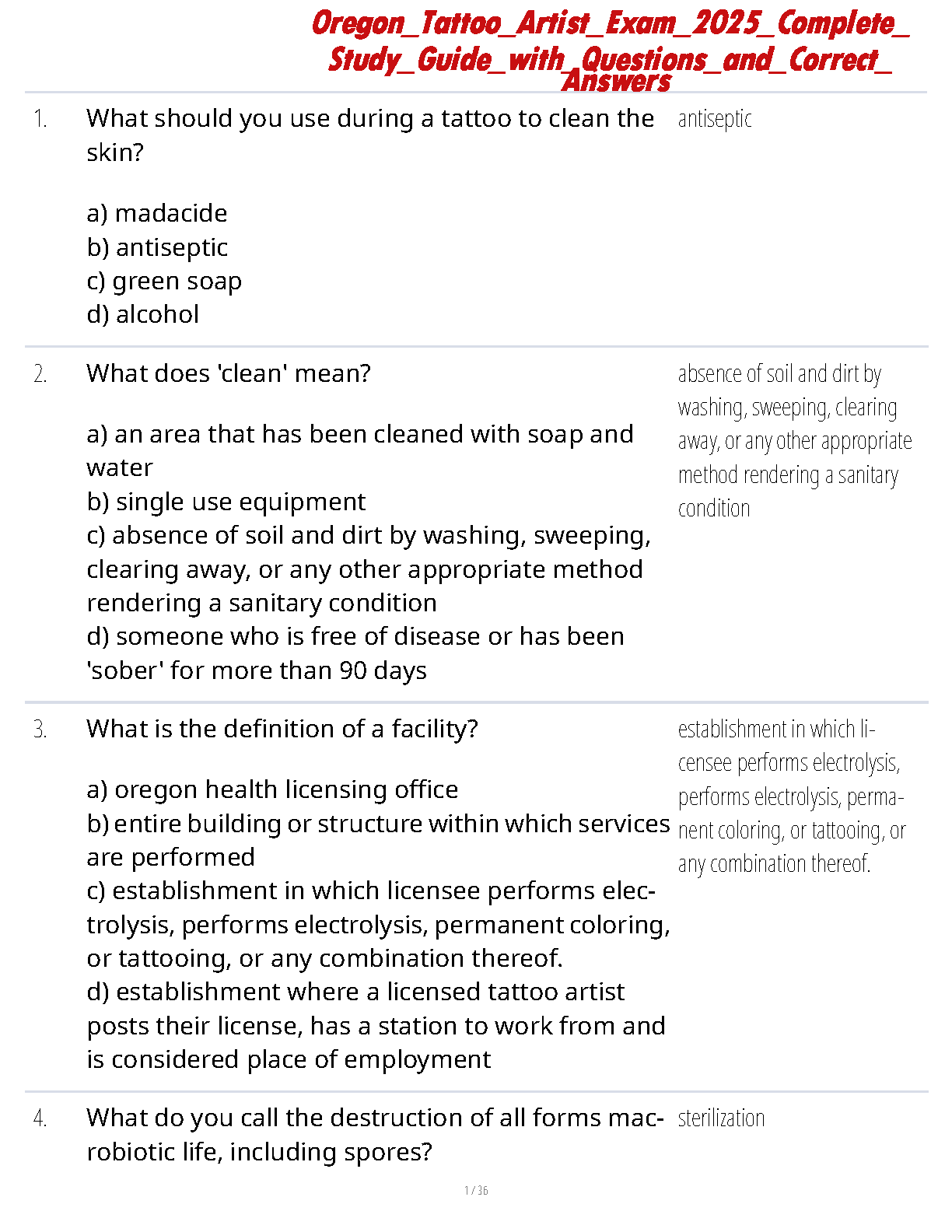 Oregon Tattoo Artist Exam 2025 Complete Study Guide with Questions and Answers by Unknown Author