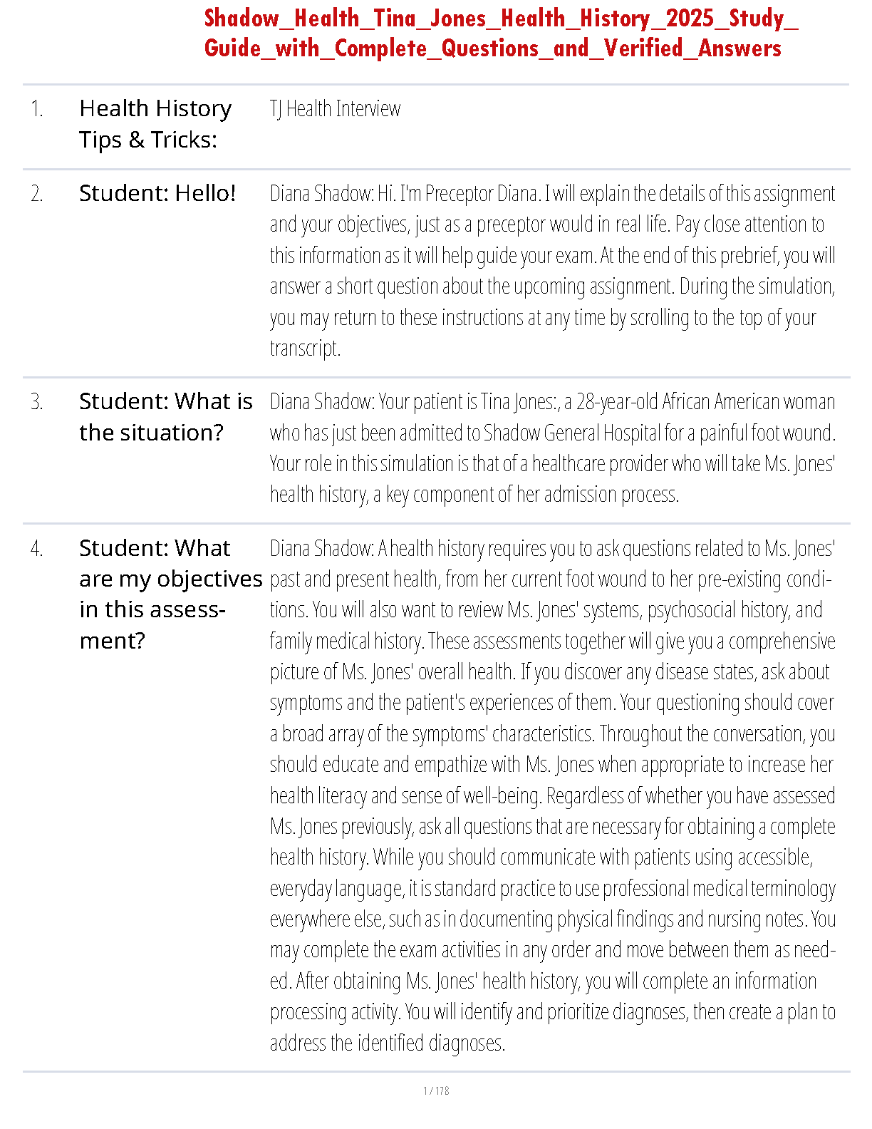 Shadow Health Tina Jones Health History 2025 Study Guide with Complete Questions and Verified Answers by Diana Shadow