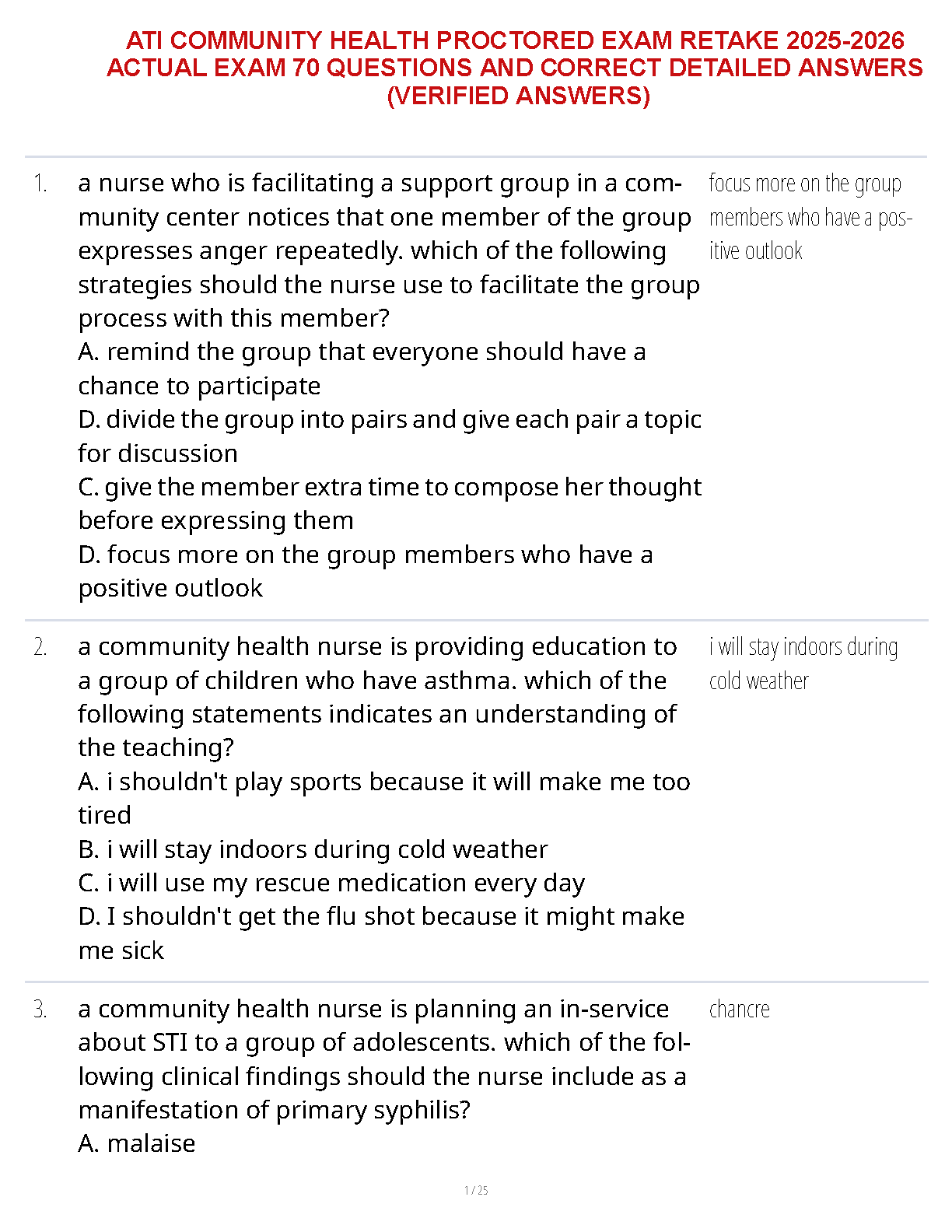 Ace your ATI Community Health Proctored Exam with this comprehensive study guide featuring 70 questions and verified answers. Designed to help students pass on their first attempt and avoid resits. Perfect for the 2024-2025 academic year.
