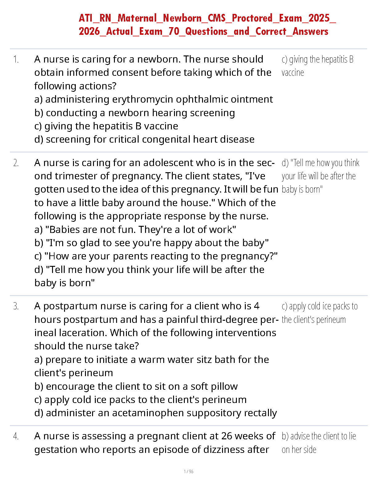 Ace your ATI RN Maternal Newborn CMS Proctored Exam with this comprehensive 2025-2026 study guide. This resource contains 70 actual exam questions and correct answers, ensuring you're well-prepared for exam day and pass on your first attempt.