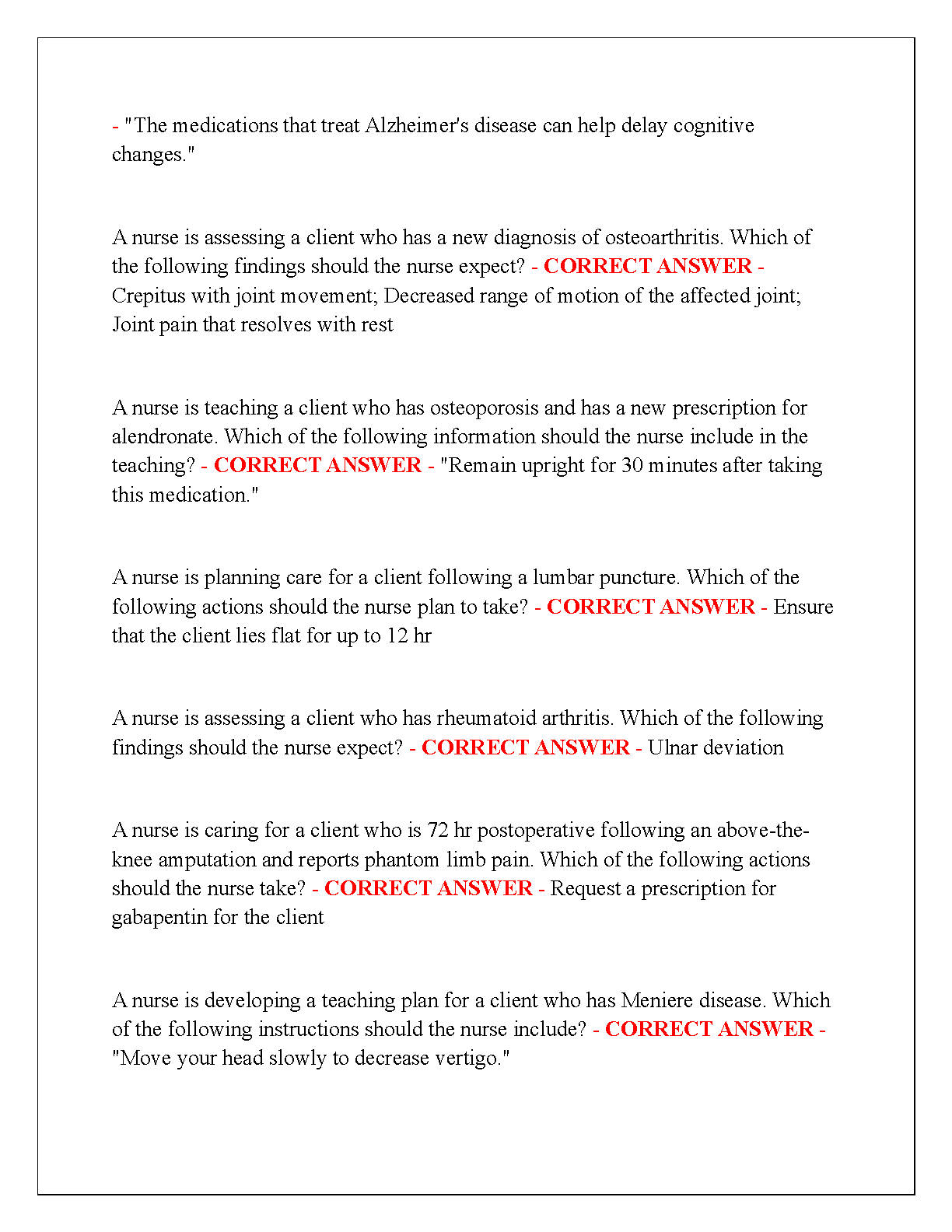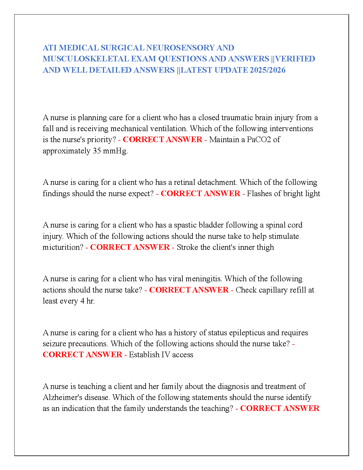 ATI Medical Surgical, Neurosensory, and Musculoskeletal Exam Questions and Answers: 2024-2025 Edition by Unknown Author