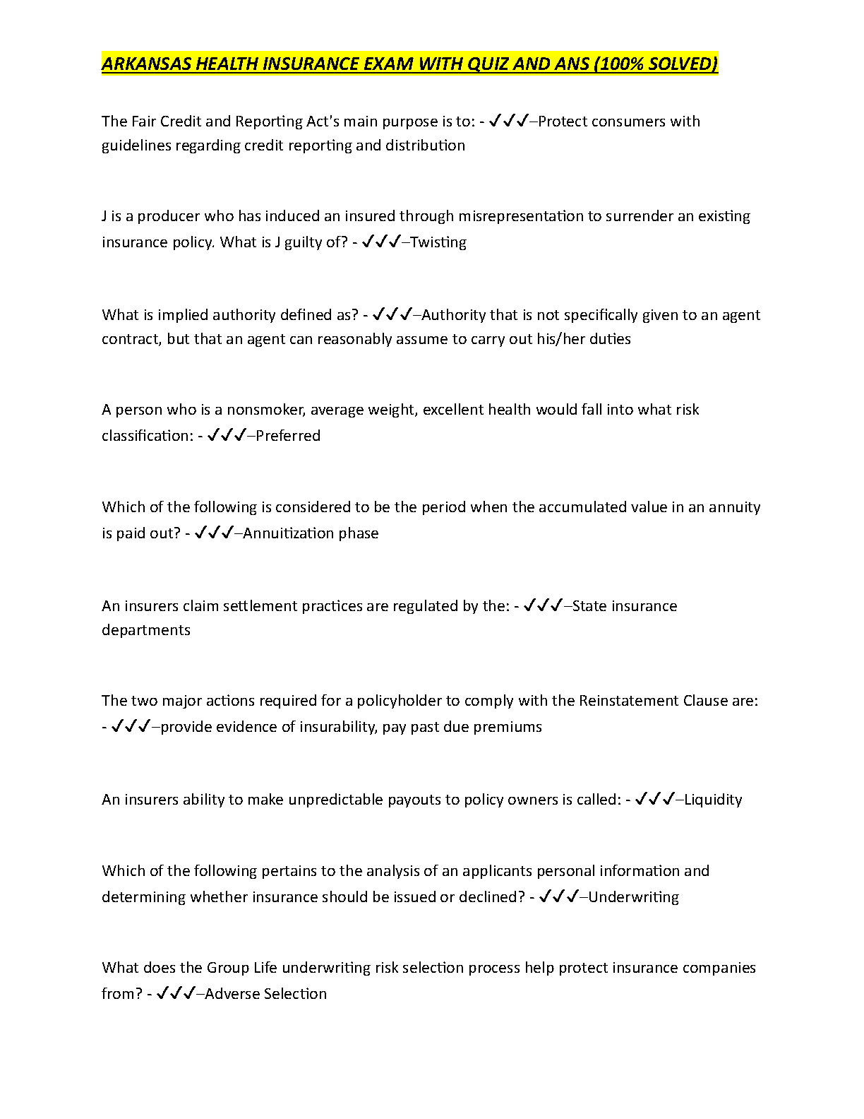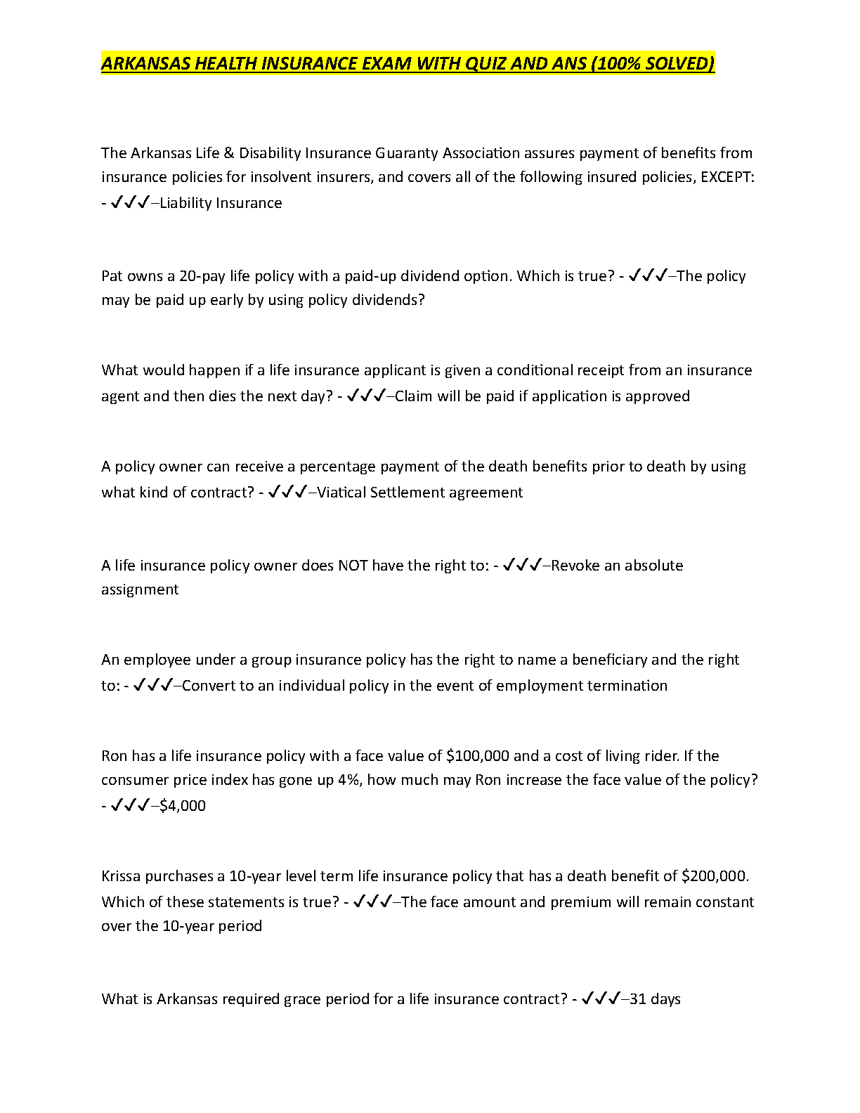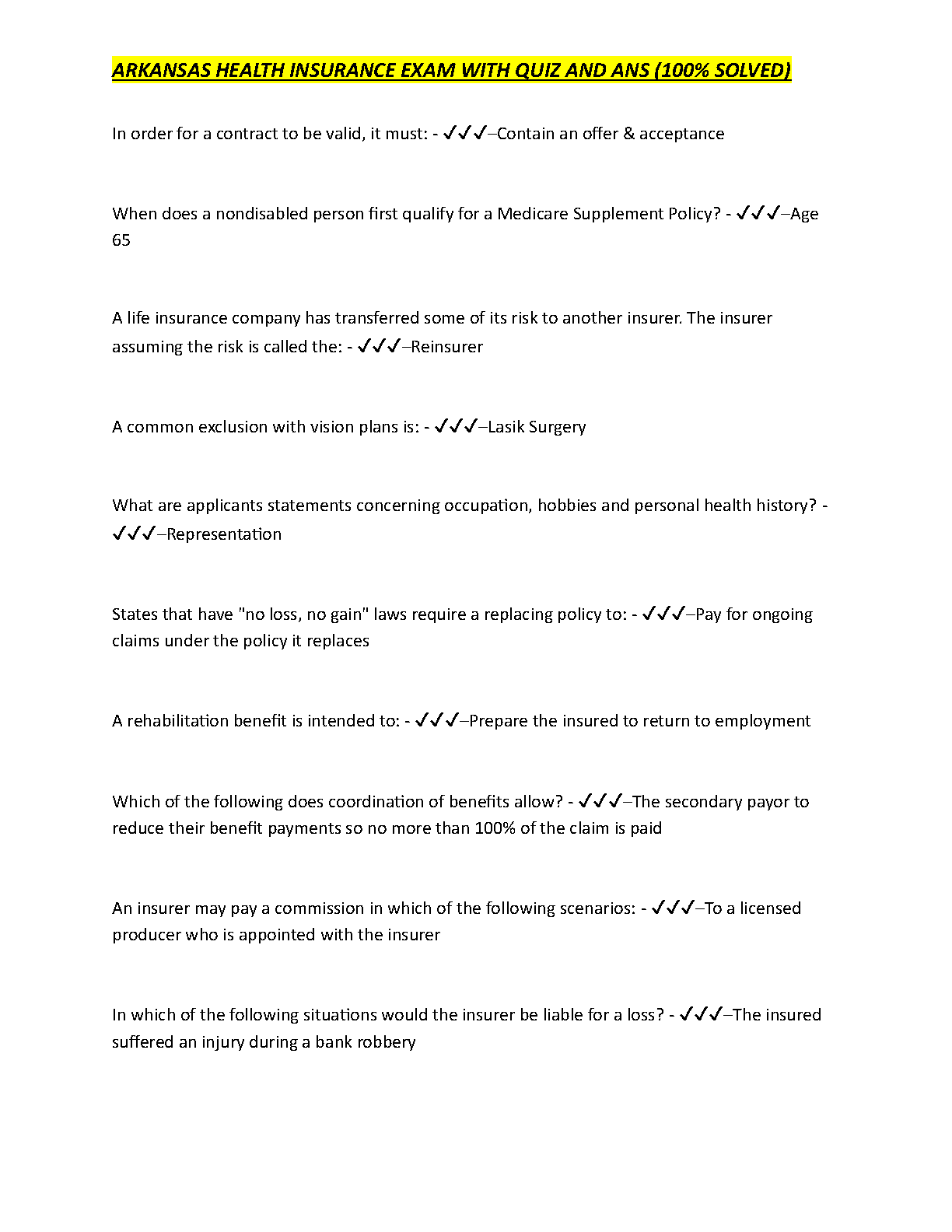 Arkansas Health Insurance Exam Quiz and Answers (100% Solved)