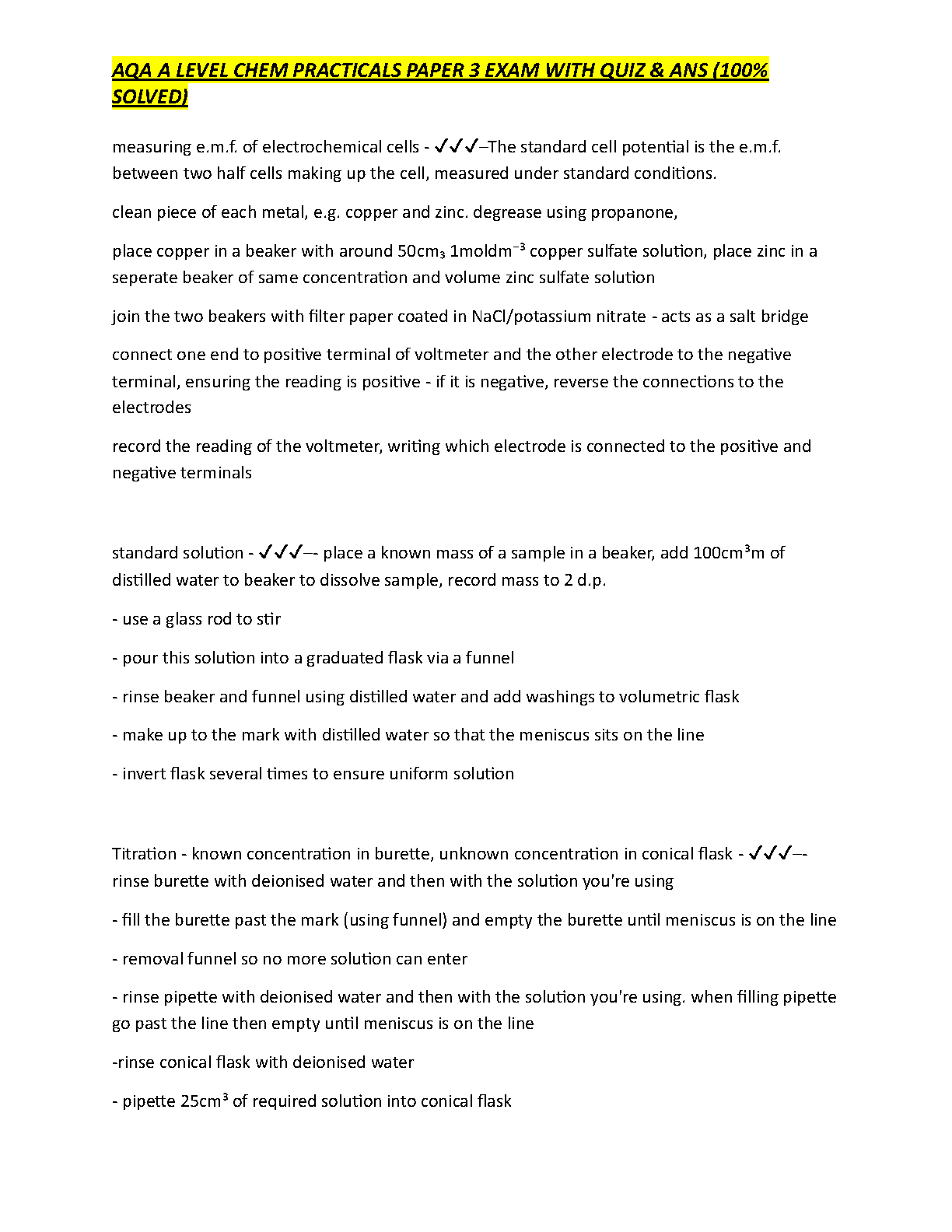 AQA A Level Chemistry Practicals Paper 3 Exam with Quiz & Answers (100% Solved) by [Author Names - If not found, replace with "AQA Exam Board"]