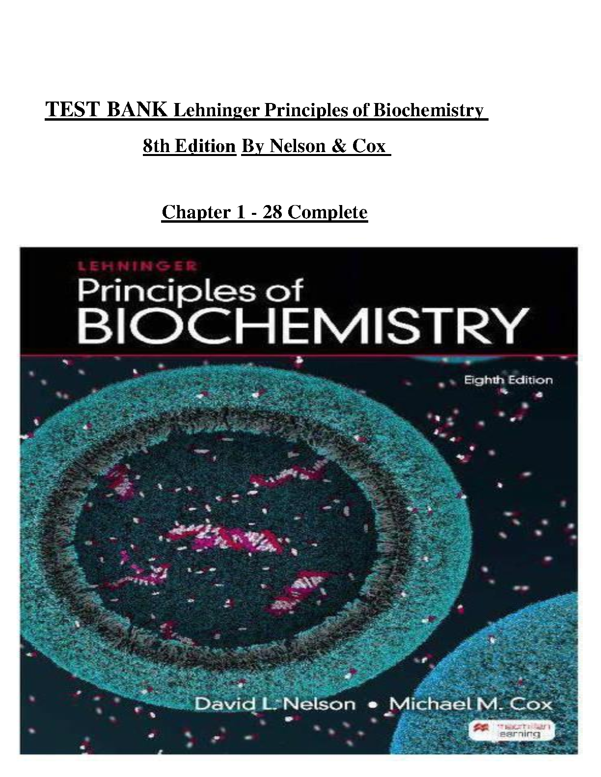 Lehninger Principles of Biochemistry, 8th Edition Test Bank by David L. Nelson and Michael M. Cox: Complete Chapters 1-28