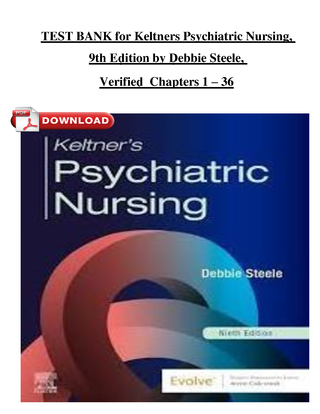 Access the complete test bank for Keltner's Psychiatric Nursing, 9th Edition, by Debbie Steele and Mary Ann Redmond. This resource includes verified chapters 1-36, providing comprehensive exam preparation to help nursing students achieve exam success on their first attempt.