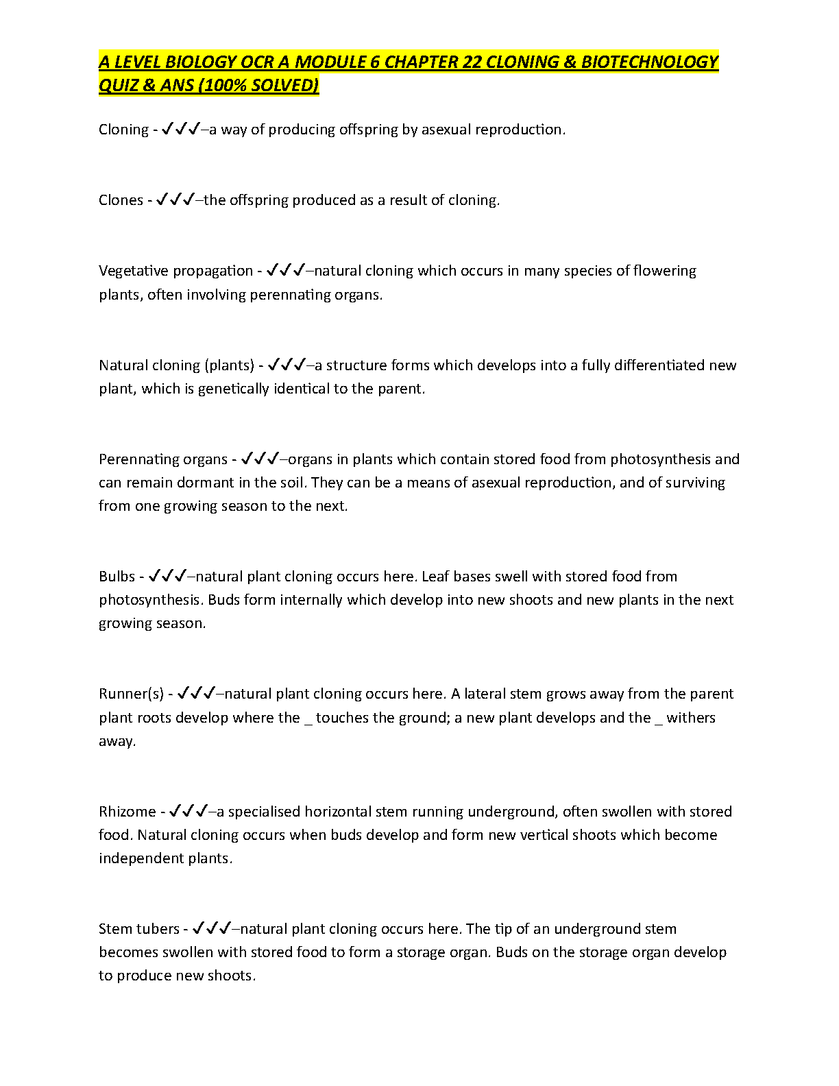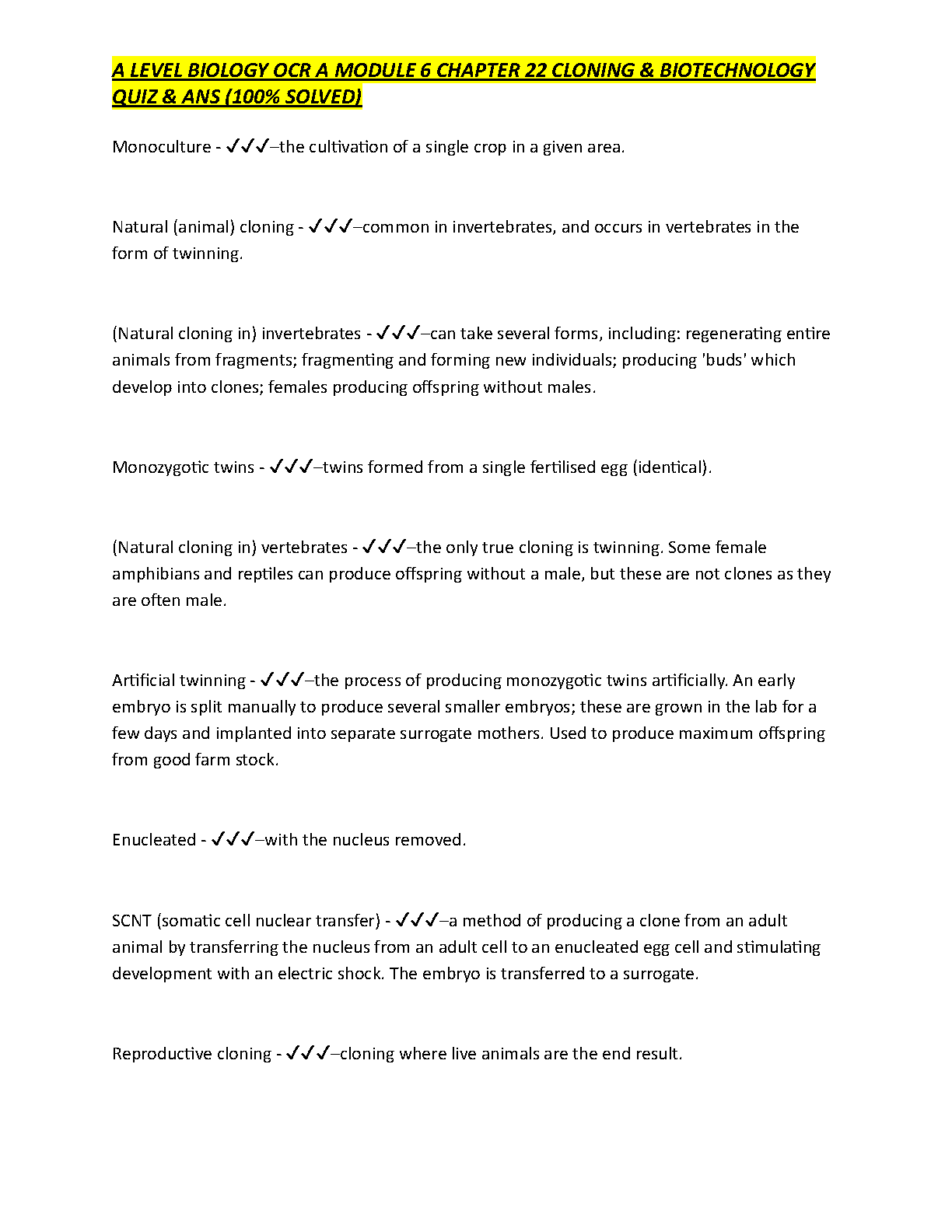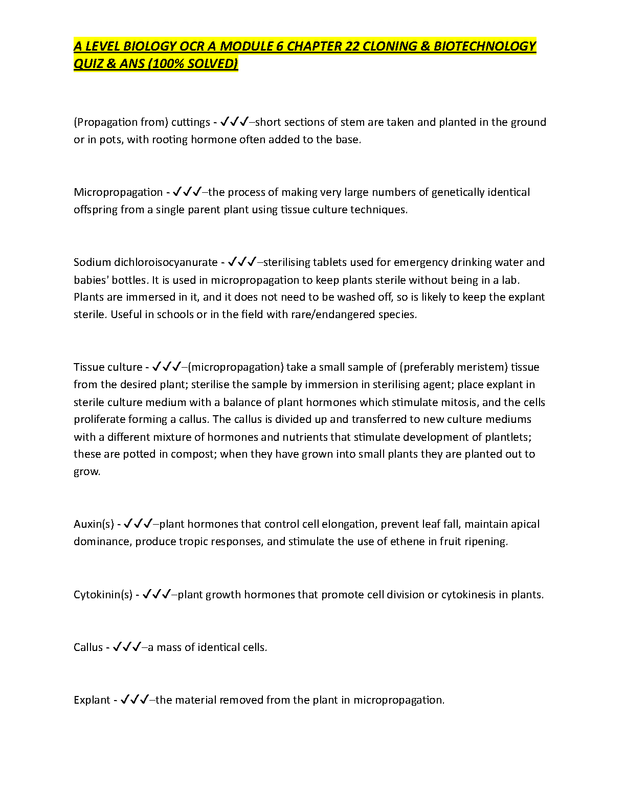 A Level Biology OCR A Module 6 Chapter 22 Cloning & Biotechnology Quiz & Answers (100% Solved)
