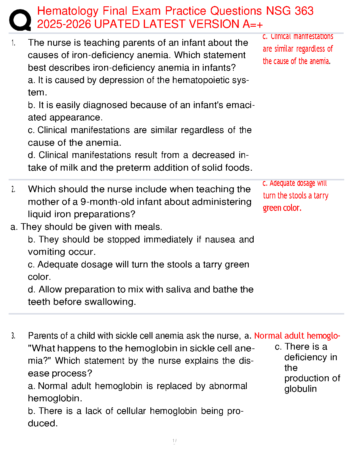 Hematology Final Exam Practice Questions NSG 363: 2025-2026 Updated Latest Version A+