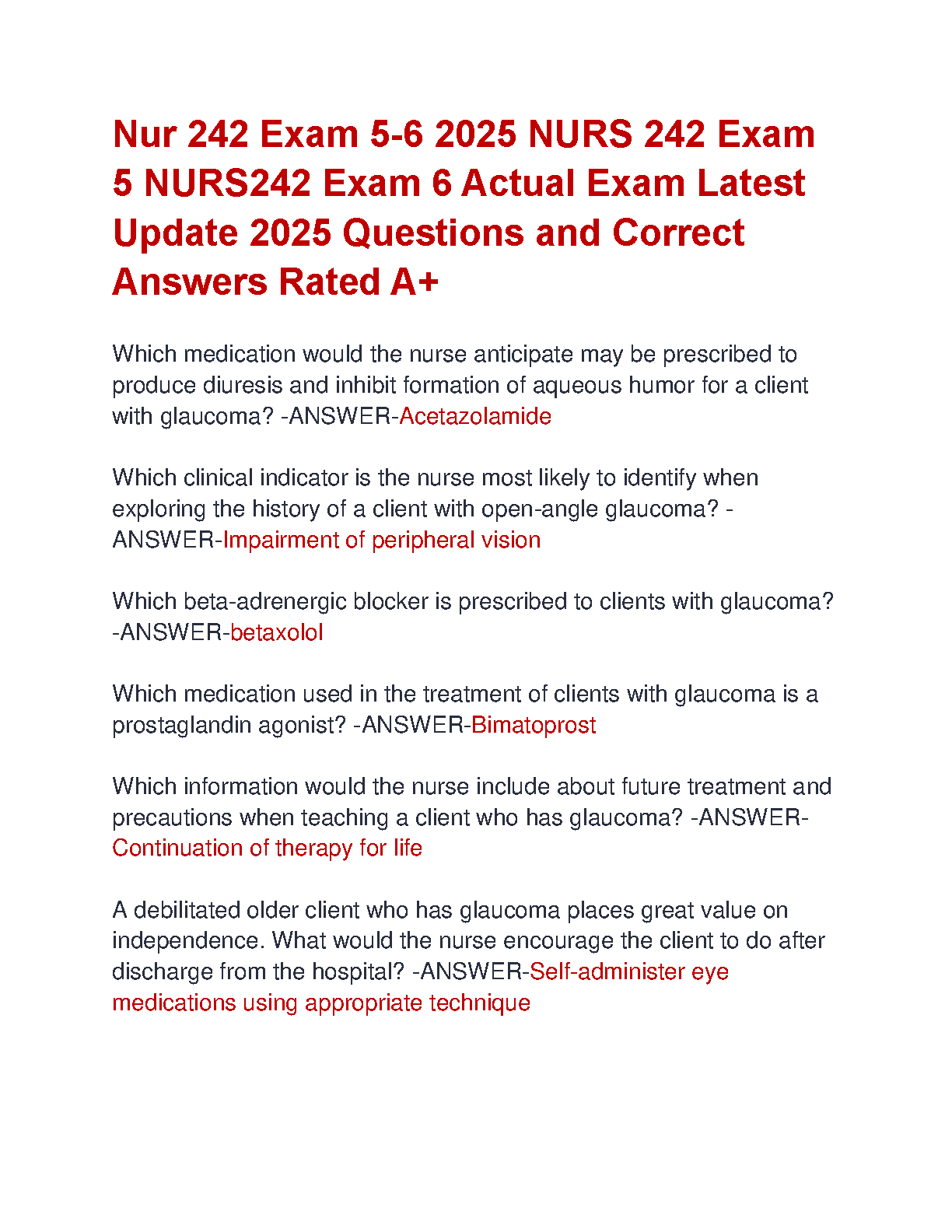 Ace your NURS 242 Exam with this comprehensive guide featuring actual exam questions and answers rated A+. Prepare for success and avoid resits in the 2024-2025 academic year.